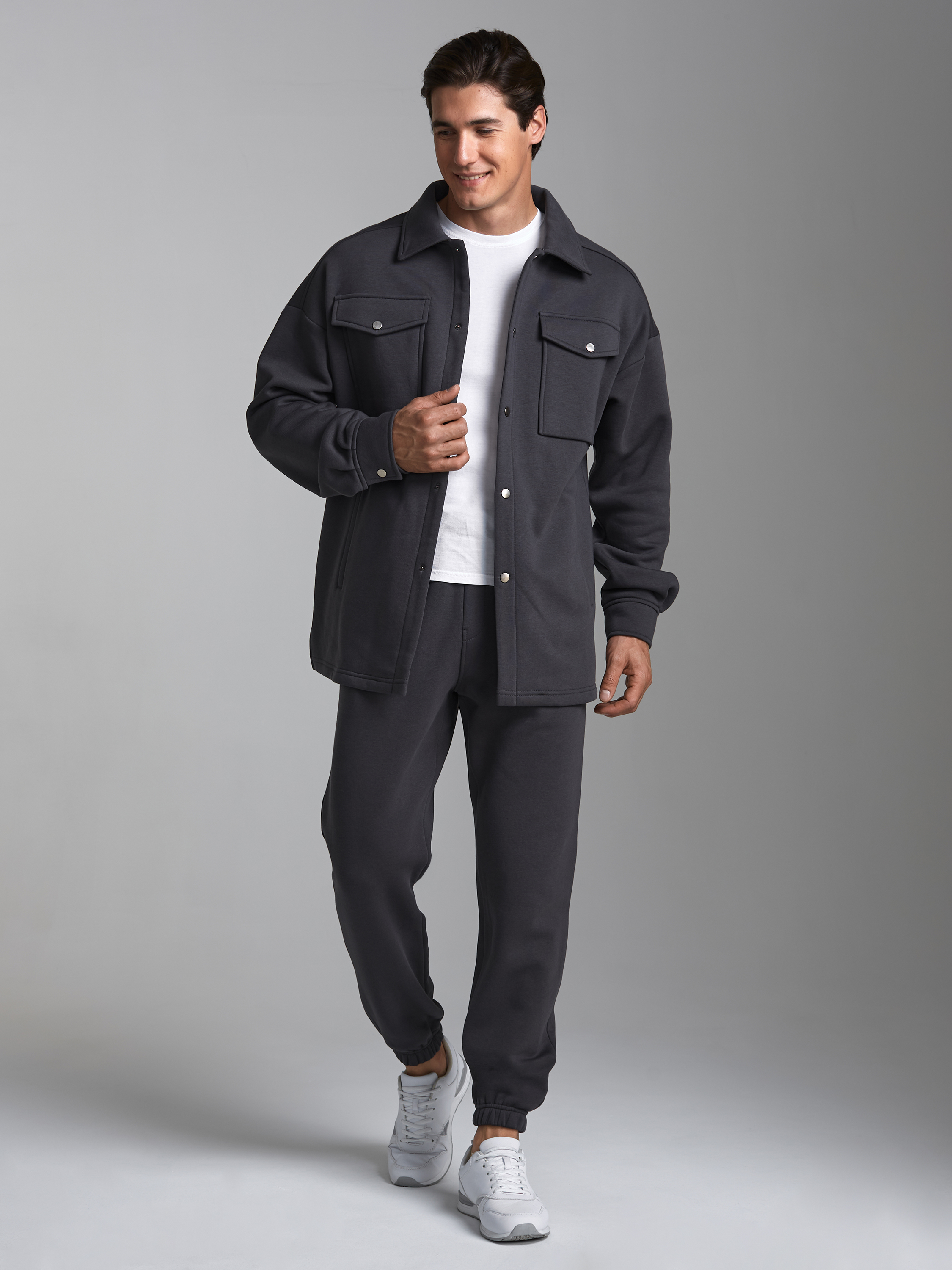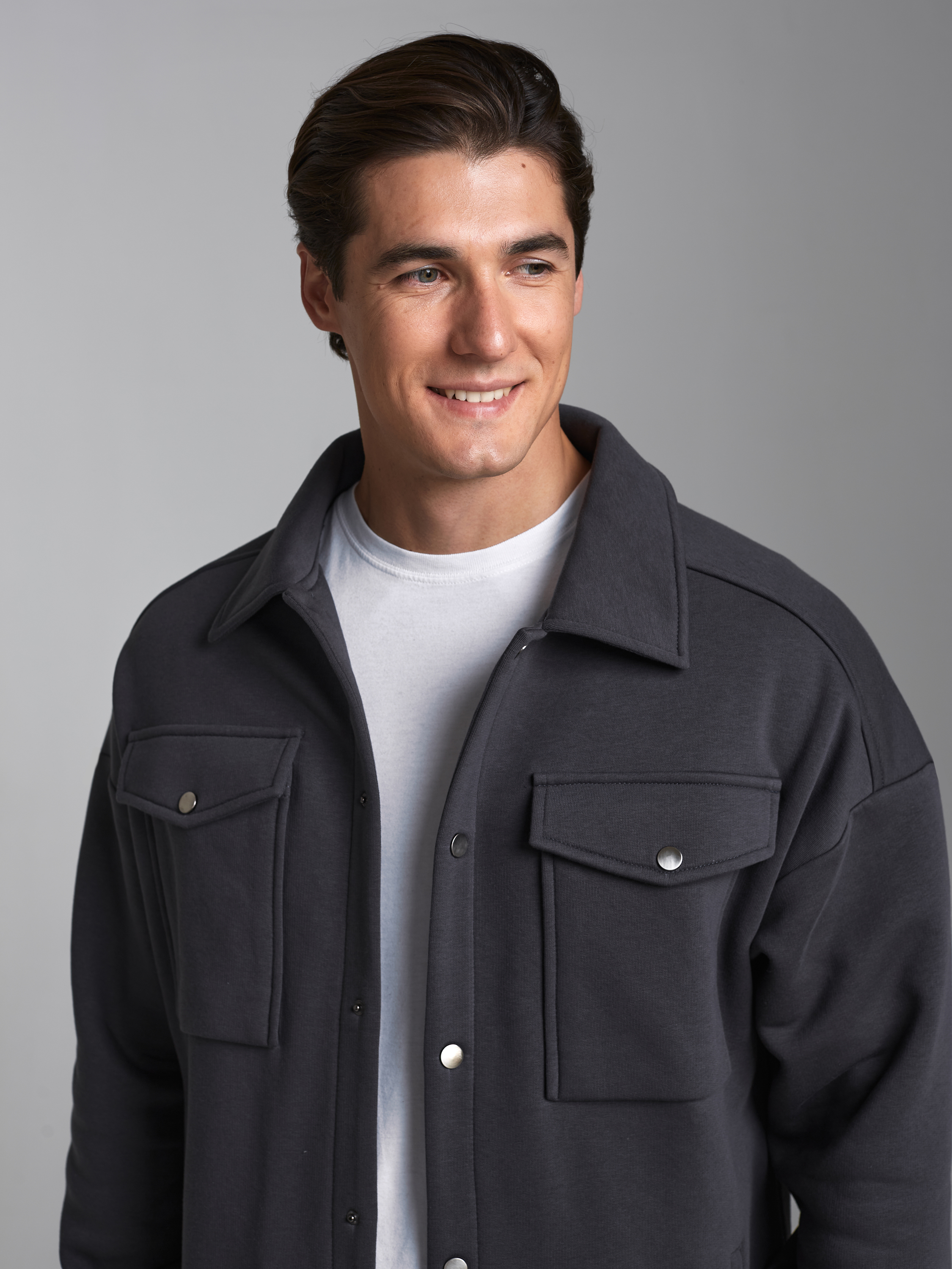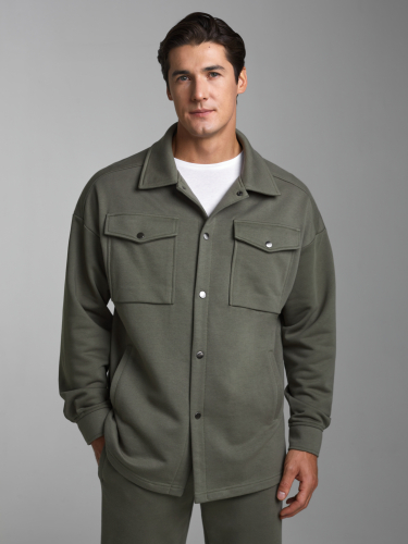 Толстовка- рубашка мужская из плотного и мягкого хлопкового трикотажного полотна с изнаночным начесом. Рукава втачные, свободные, со спущенной линией плеча. Широкие манжеты застегиваются на кнопки. Тостовка имеет четыре удобных кармана - два накладных нагрудных кармана с клапанами и два прорезных расположенных ниже, на уровне бедер. Воротник стояче-отложной. Застегивается изделие на металлические кнопки. 65% хлопок, 35% полиэстер