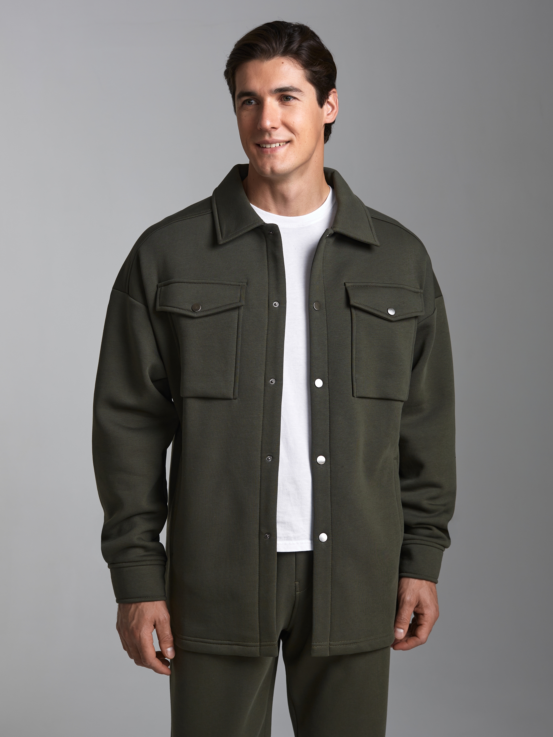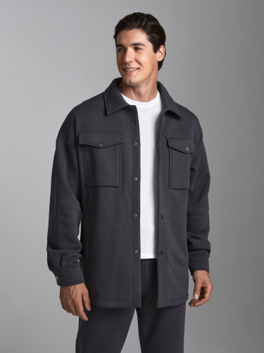 Толстовка- рубашка мужская из плотного и мягкого хлопкового трикотажного полотна с изнаночным начесом. Рукава втачные, свободные, со спущенной линией плеча. Широкие манжеты застегиваются на кнопки. Тостовка имеет четыре удобных кармана - два накладных нагрудных кармана с клапанами и два прорезных расположенных ниже, на уровне бедер. Воротник стояче-отложной. Застегивается изделие на металлические кнопки. 65% хлопок, 35% полиэстер