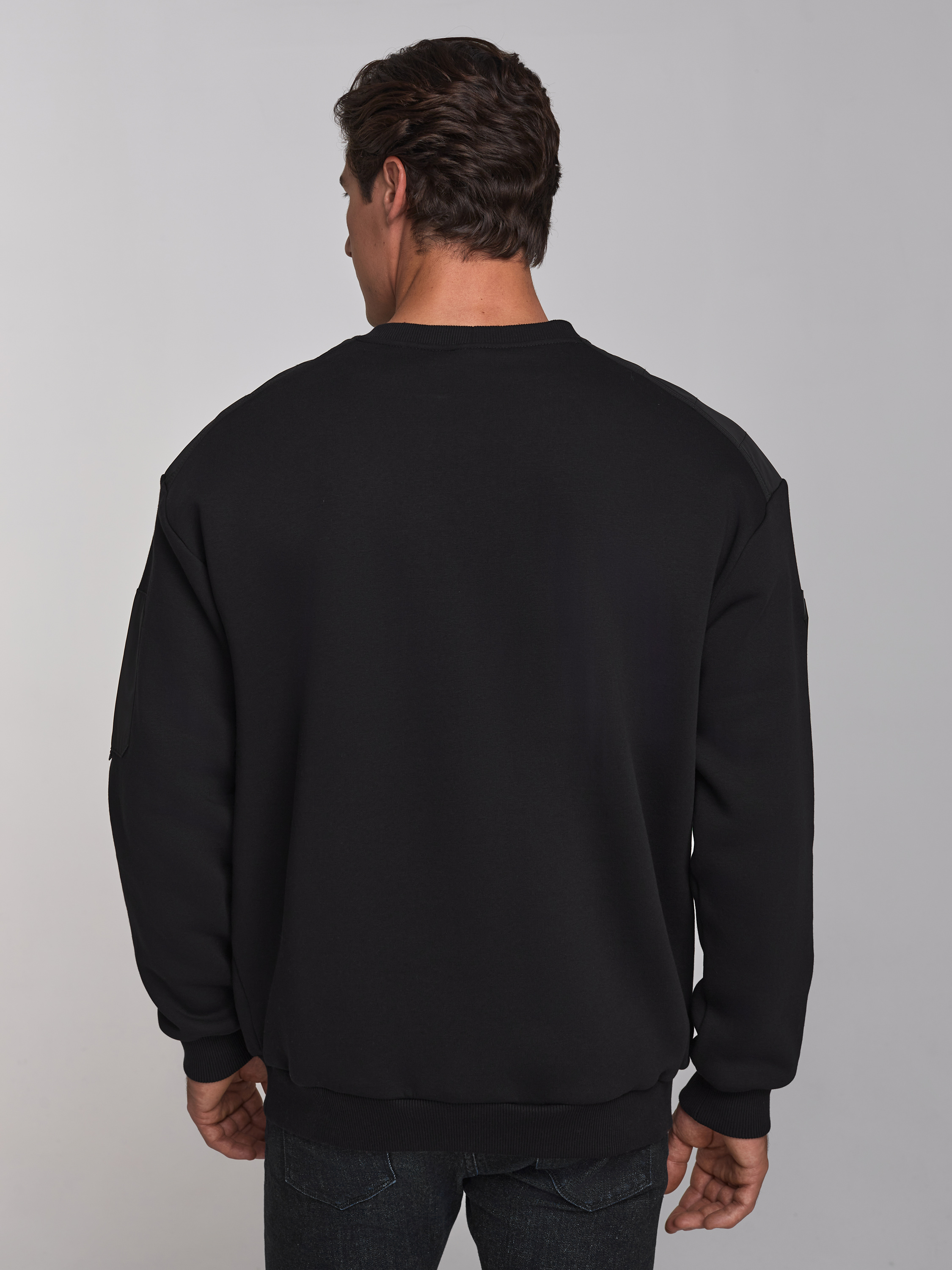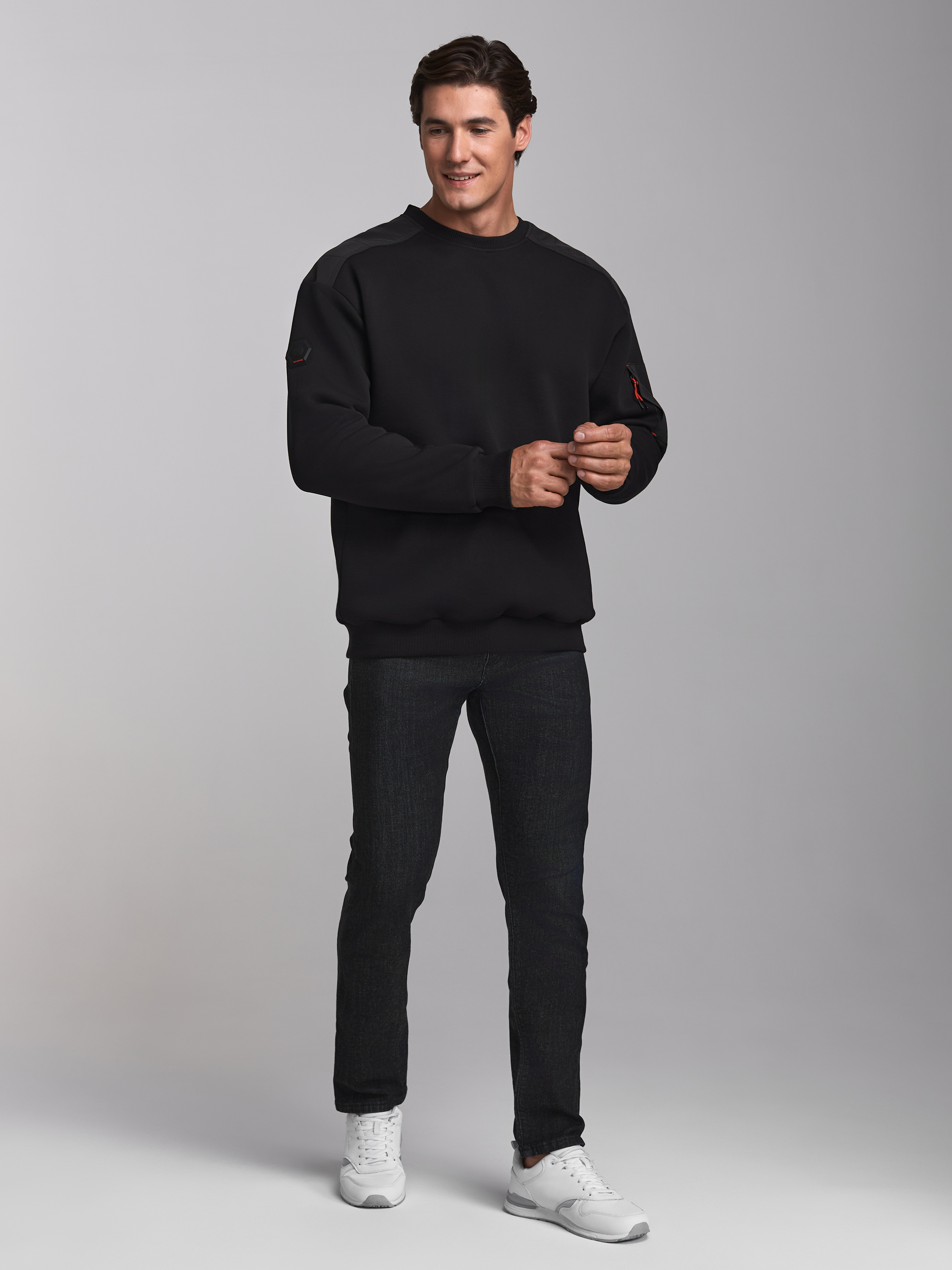 Свитшот изготовлен из плотного хлопкового трикотажного полотна с изнаночным начесом. Изделие на поясе, стеганные кокетки продублированы плащевой тканью. Из нее так же изготовлен накладной карман левого рукава. Карман застёгивается на молнию. Пояс, бейка горловины и манжеты куртки изготовлены из плотной эластичной трикотажной резинки. На верхней части правого рукава - шеврон с фирменным логотипом. 65% хлопок, 35% полиэстер