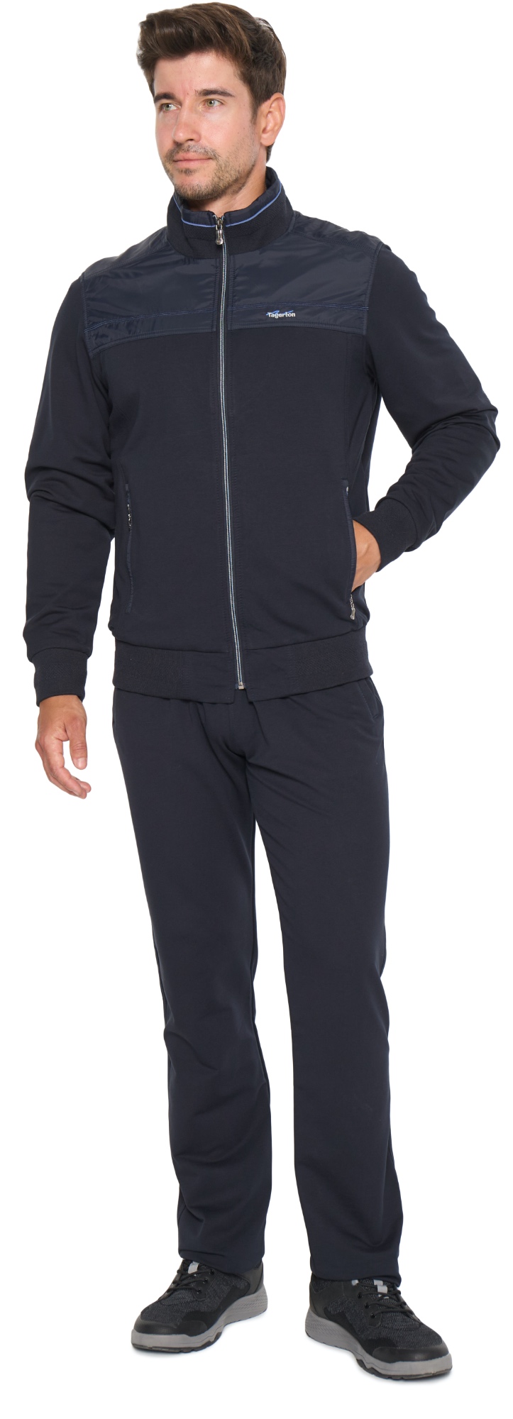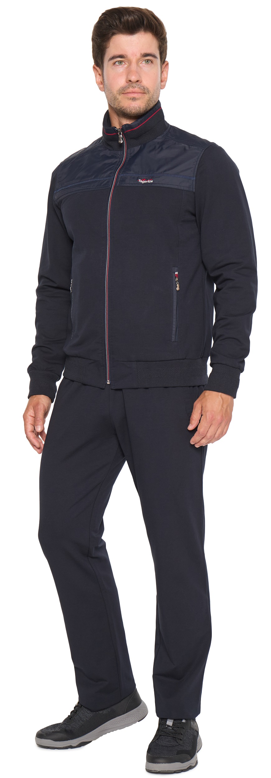 Особенность модели – пояс, манжеты и ворот толстовки отшиты из рибаны с рельефом. Молния в борт декорирована цветными нитками (светло-серая/гранат или светло-серая/парламент). Верхняя часть ворота, полочек и задняя кокетка отделаны нейлон таффетой. Полочки декорированы вышивками в тон основного материала, ворот – цветным кантом. К вертикальным рельефам на полочках толстовки примыкают передние карманы на молниях, прикрытых полулисточками из нейлон таффеты в тон трикотажа. Завершители молний – 2-х цветные (в тон отделки). На левой стороны груди 2-х цветная вышивка в фирменном стиле. Брюки с поясом на резинке. Брючины немного заужены к низу. С внутренней стороны пояс фиксируется шнурком. Карманы на молниях под листочками из трикотажа в тон основного материала. Сзади кокетка.