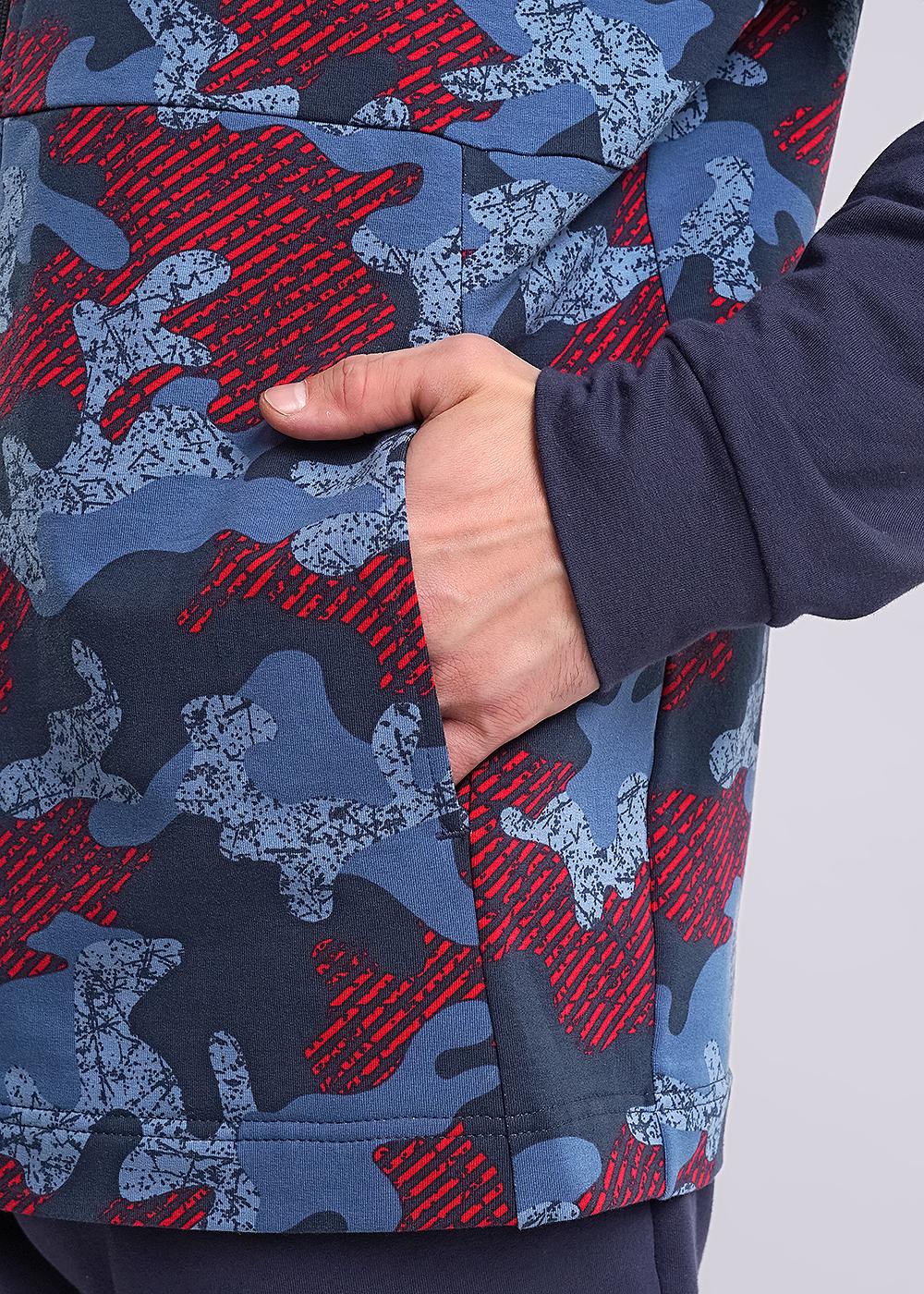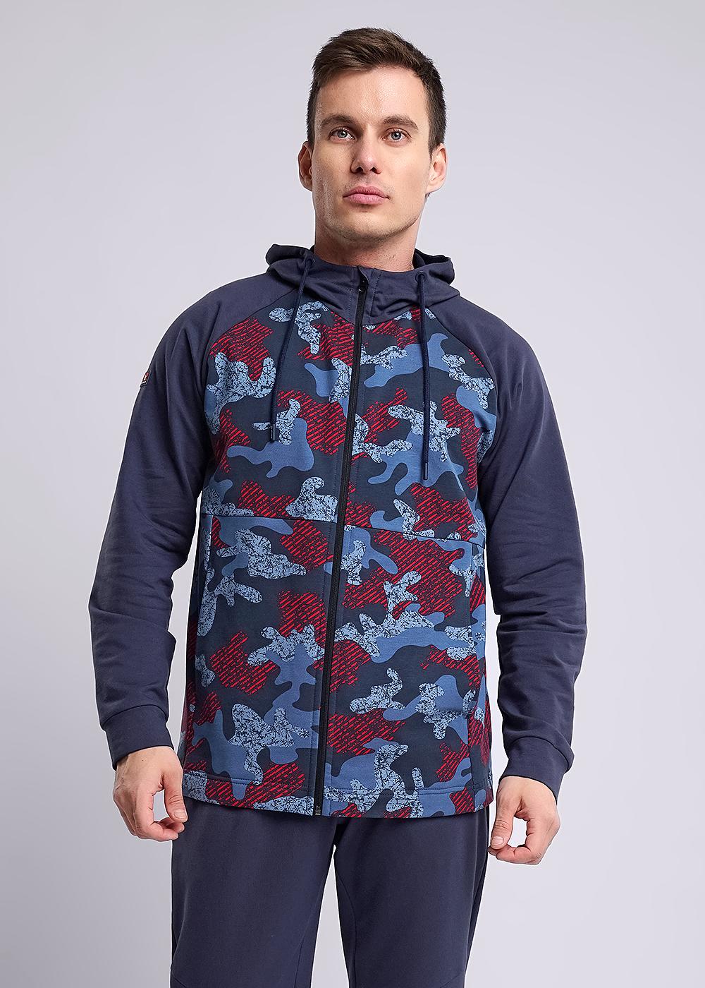 Куртка мужская комбинированная из плотного футера. Изделие на капюшоне с вместительными карманами, дополнена фирменной фурнитурой, рукава покроя реглан с манжетом по низу. Удобный и практичный вариант на каждый день.