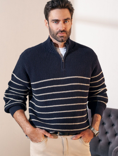 Свитер с узором полосы выполнен из хлопковой пряжи с добавлением акрила. Теплая модель фактурной крупной вязки с воротом, застегивается металлической молнией. Регулируя ворот можно носить с рубашками, футболками и водолазками. Кроме того, свитер совершенно не колется, поэтому его комфортно носить даже на голое тело. Внизу изделия нашивка бренда из эко-кожи.