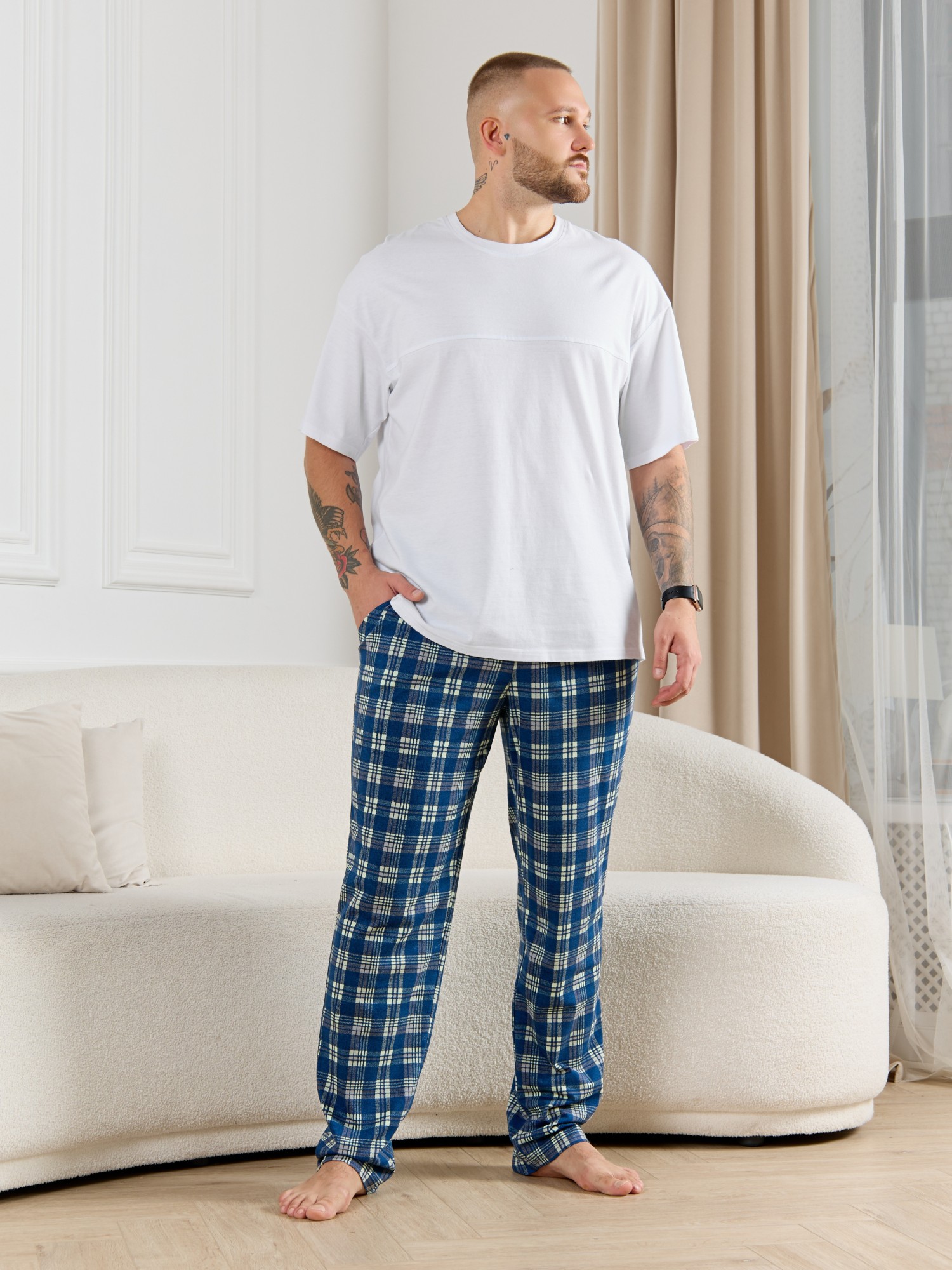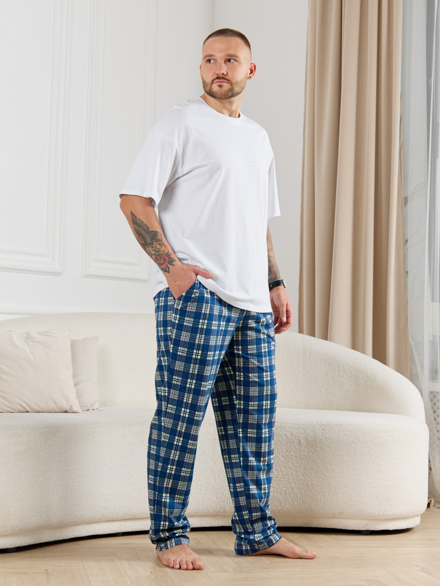 Брюки мужские из трикотажного полотна "кулирка" в клетку, свободного покроя, на притачном поясе с эластичной тесьмой внутри, с карманами в боковых швах. Нижние срезы обработаны подгибкой.