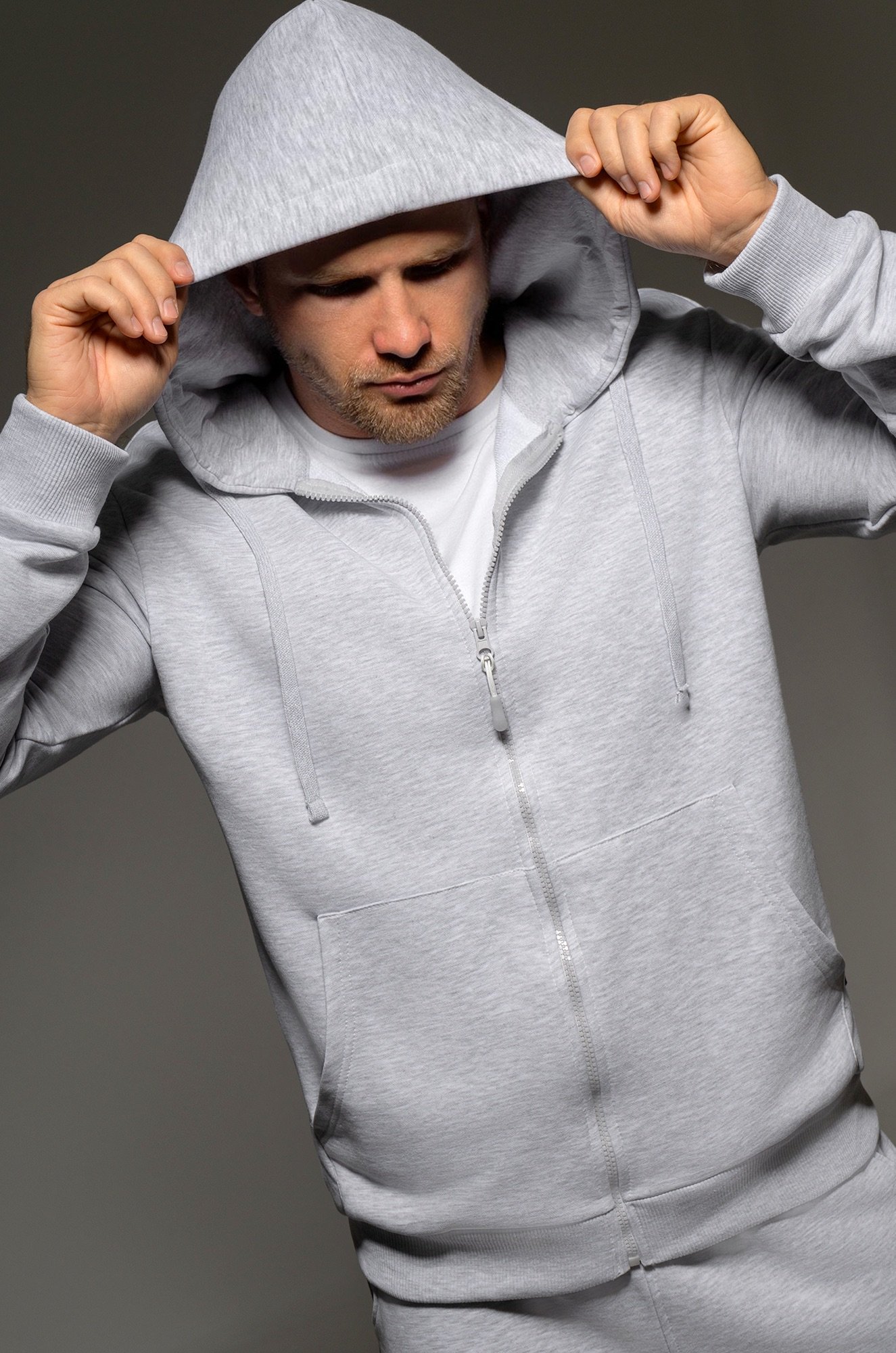 — костюм с толстовкой с глубоким капюшоном дарит уют и комфорт;