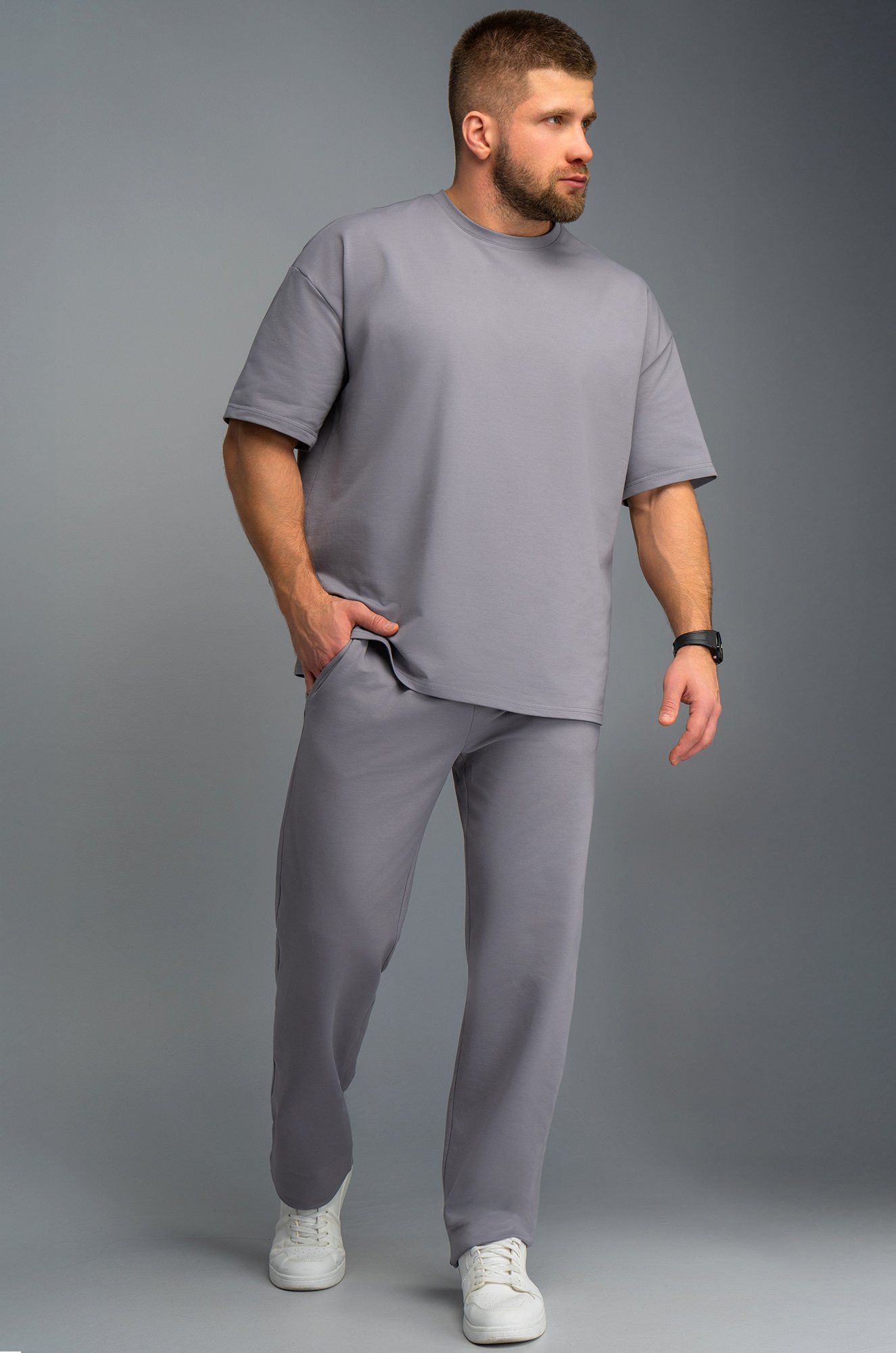 Мужск..показатьой летний костюм двойка представлен в лаконичном сером цвете. Костюм с брюками и футболкой оверсайз станет идеальным выбором для лета или весны.