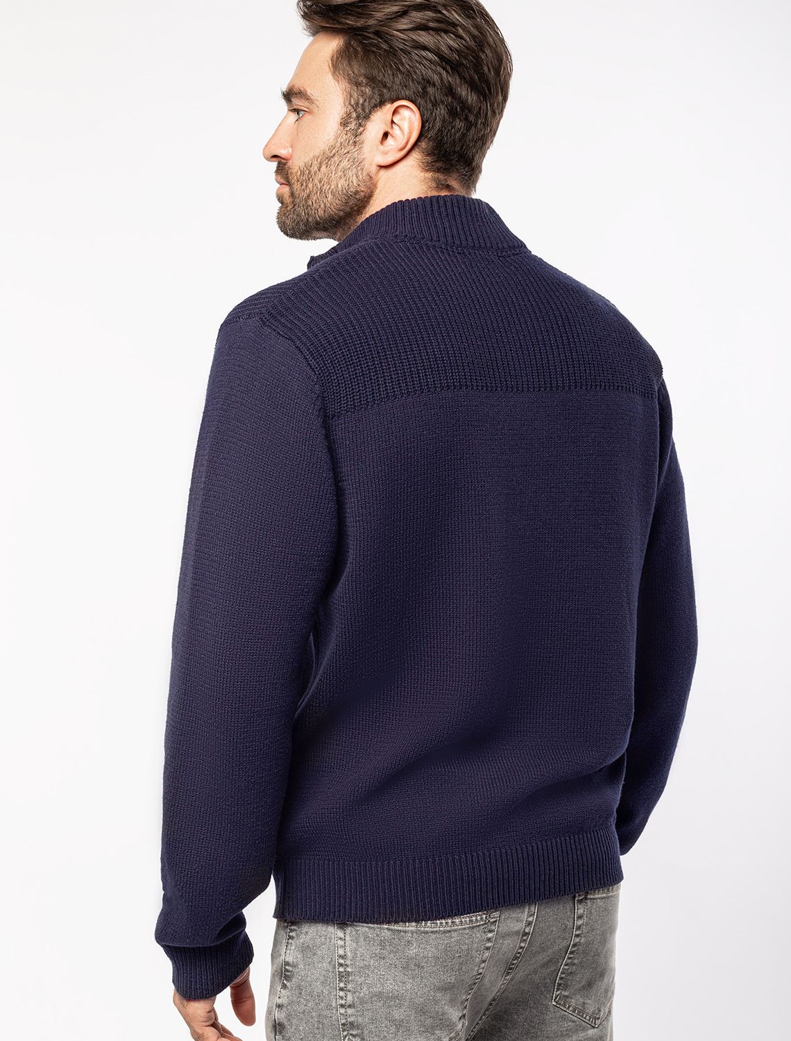 Свитер фактурной вязки с застежкой на крупные кнопки выполнен из мягкой хлопковой пряжи с добавлением акрила. Модель из такого материала не препятствует циркуляции воздуха, но при этом хорошо сохраняет тепло и не колется, поэтому ее комфортно носить на голое тело. С помощью кнопок можно регулировать высоту воротника и носить свитер по-разному. Внизу изделия нашивка бренда из эко-кожи. темно-синий