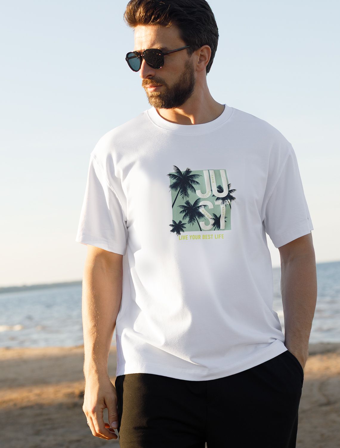 Перевод принта: Live your best live - живи свою лучшую жизнь. Футболка свободного кроя выполнена из премиального хлопка. Авторский принт нанесен красками с устойчивым покрытием. Благодаря эластану, носить изделие очень комфортно, и оно сохранит свой безупречный вид в течение долгого времени. На рукаве нашивка из эко-кожи с логотипом бренда.