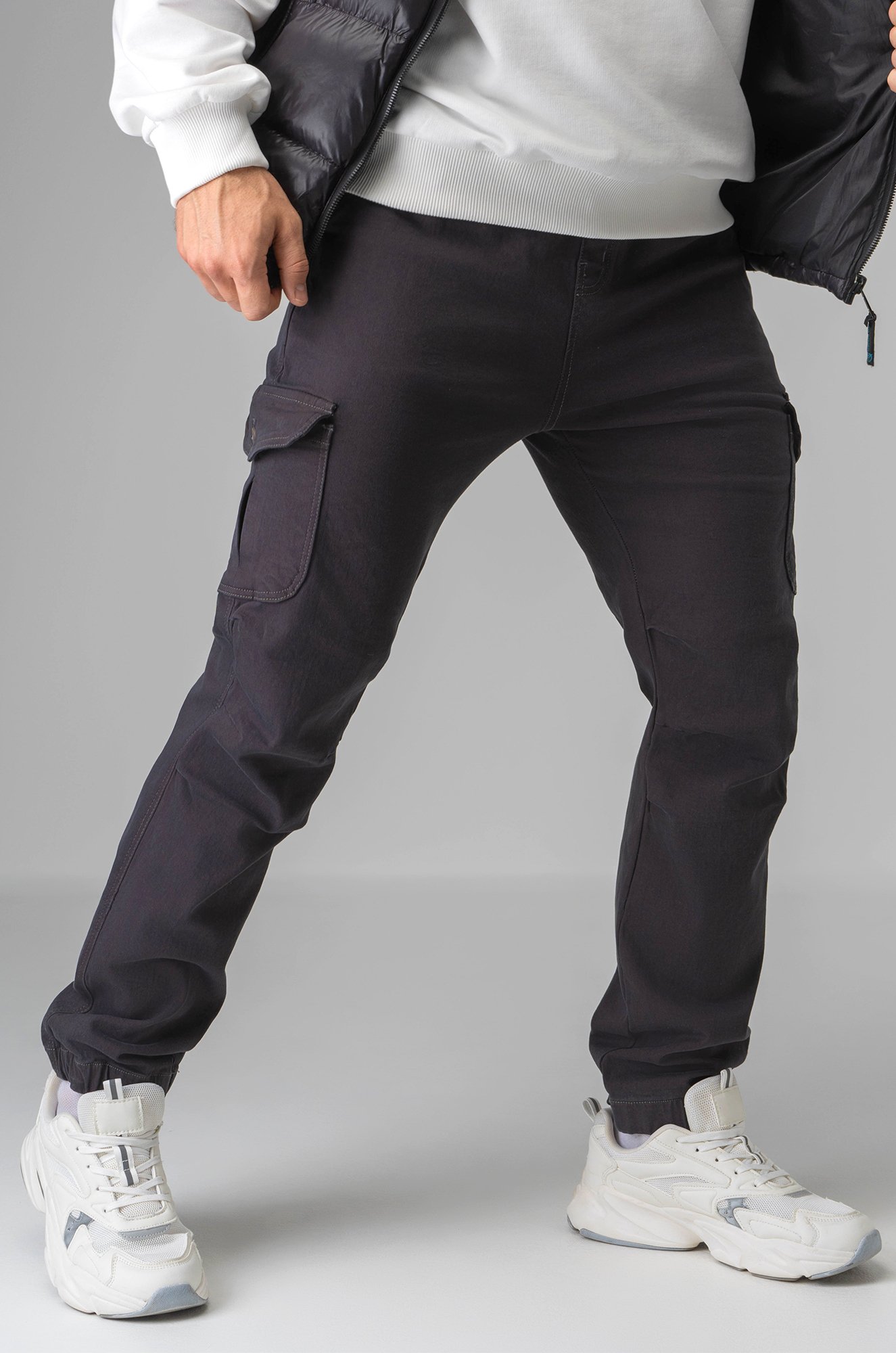Брюки выполнены из габардина дарят комфорт благодаря хлопку и лайкре. Однотонные темно-серые брюки имеют свободный крой и функциональные защипы в области колен, что предлагает максимальную свободу движений. Накладные карманы добавляют непринужденности и практичности, что делает карго универсальным элементом мужского гардероба.