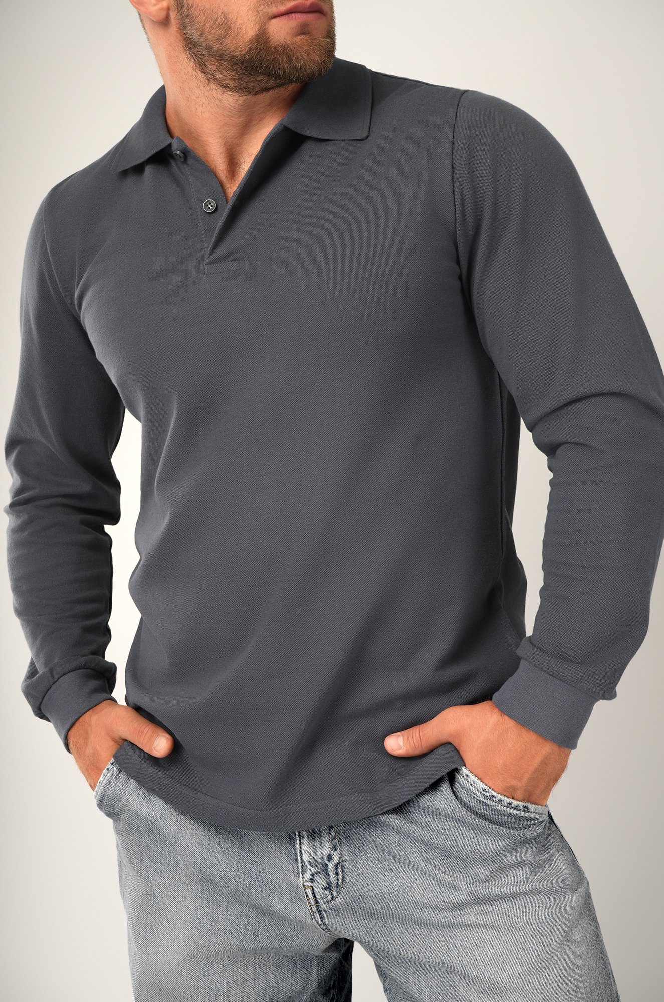 Мужской лонгслив поло из 100% хлопка —..показать универсальный вариант для офиса и активного отдыха. Базовое темно-серое поло для мужчин поможет создать брутальный кэжуал образ благодаря стильному сочетанию деталей.