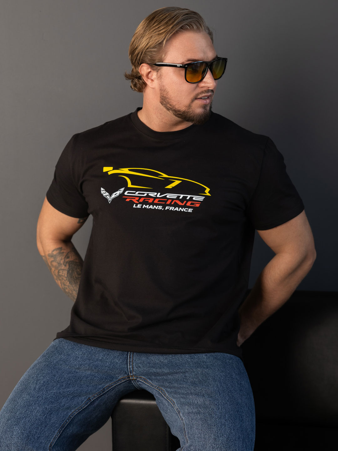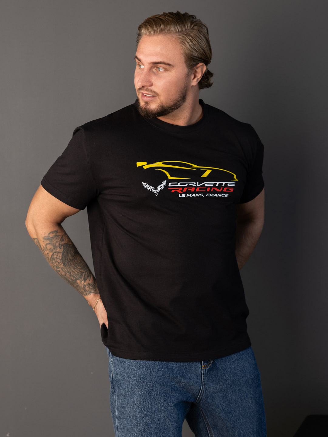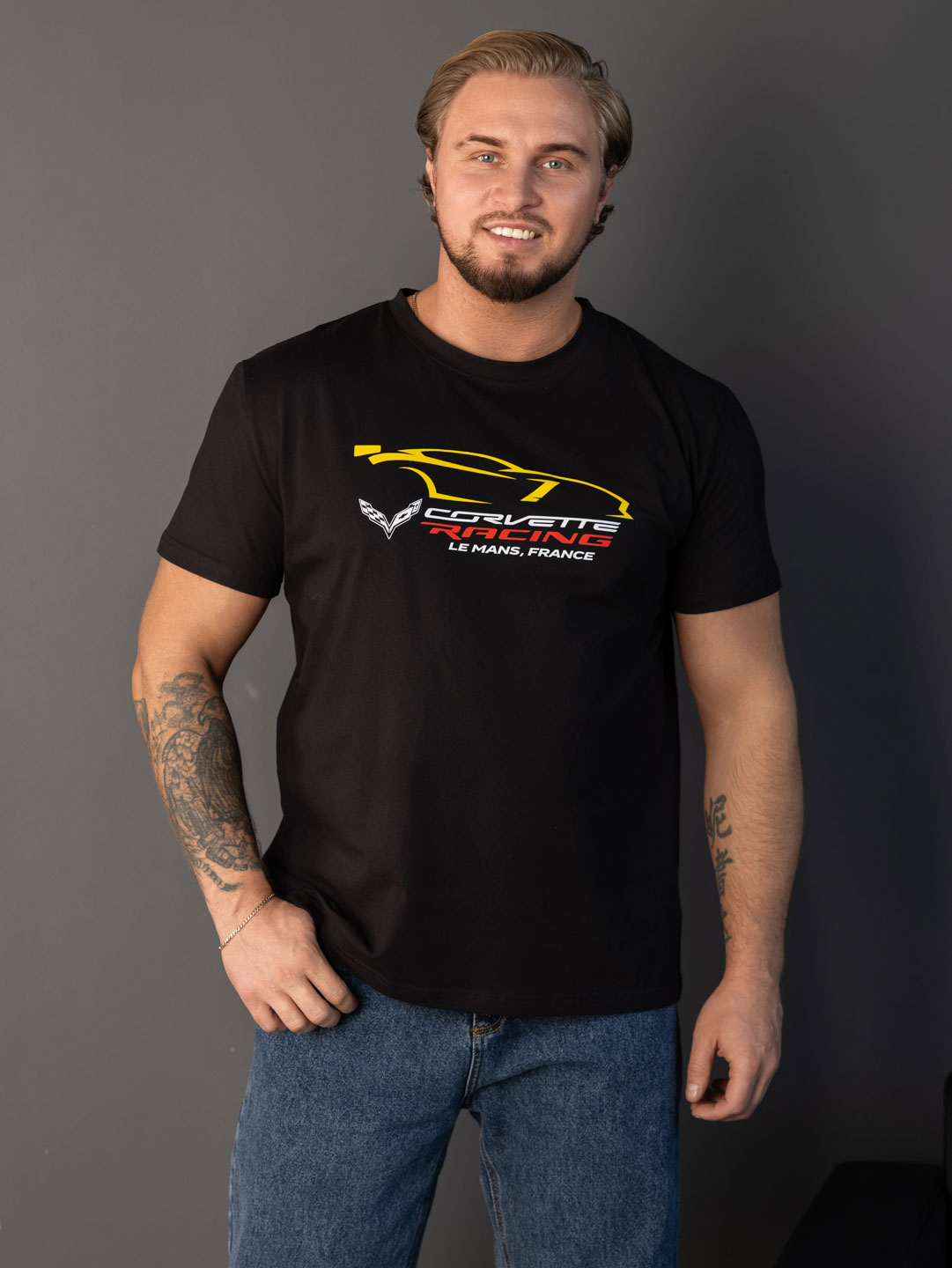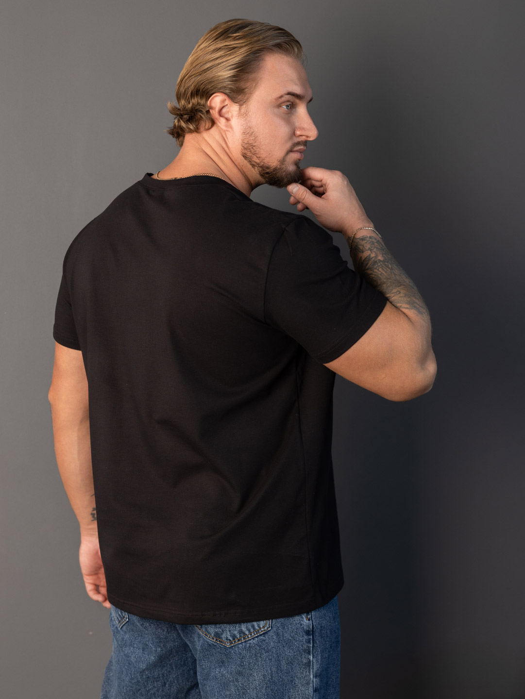 Мужская футболка из кулики с лайкрой, базового кроя, с О-образной горловиной, коротким рукавом и принтом спереди.