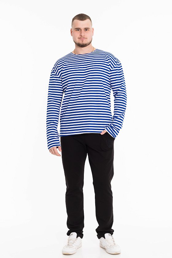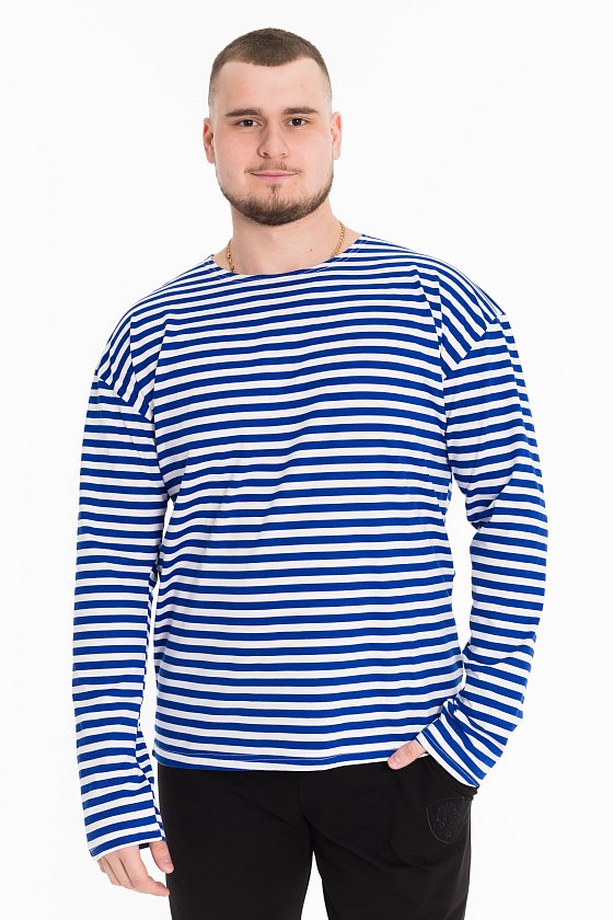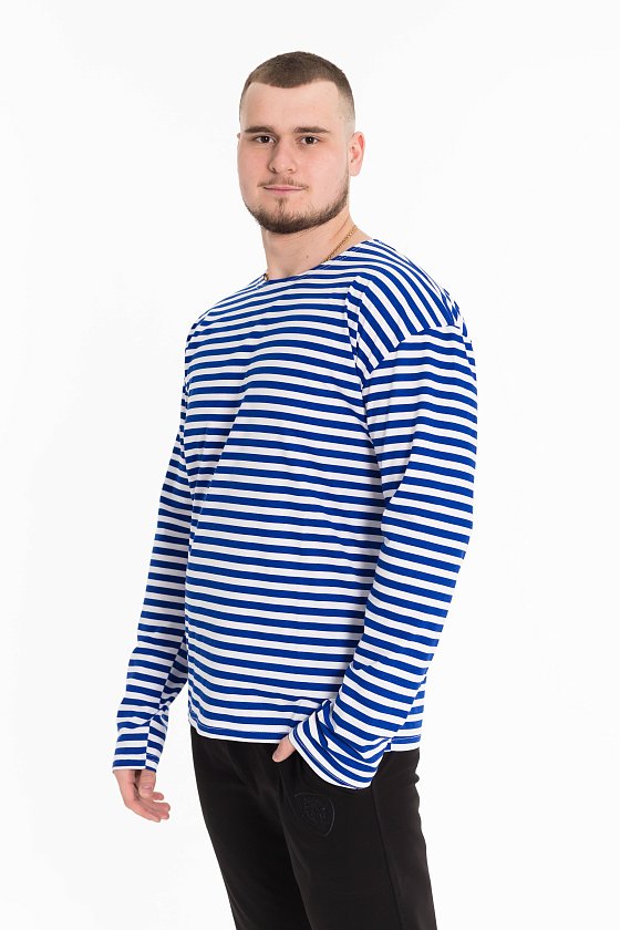 Тельняшка мужская выполнена из стопроцентного хлопка. Покрой свободный, горловина имеет круглый вырез, рукава длинные.