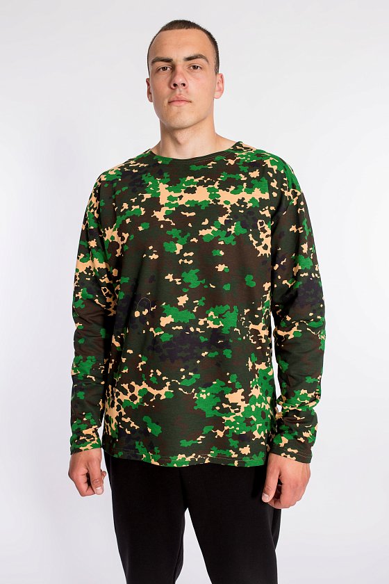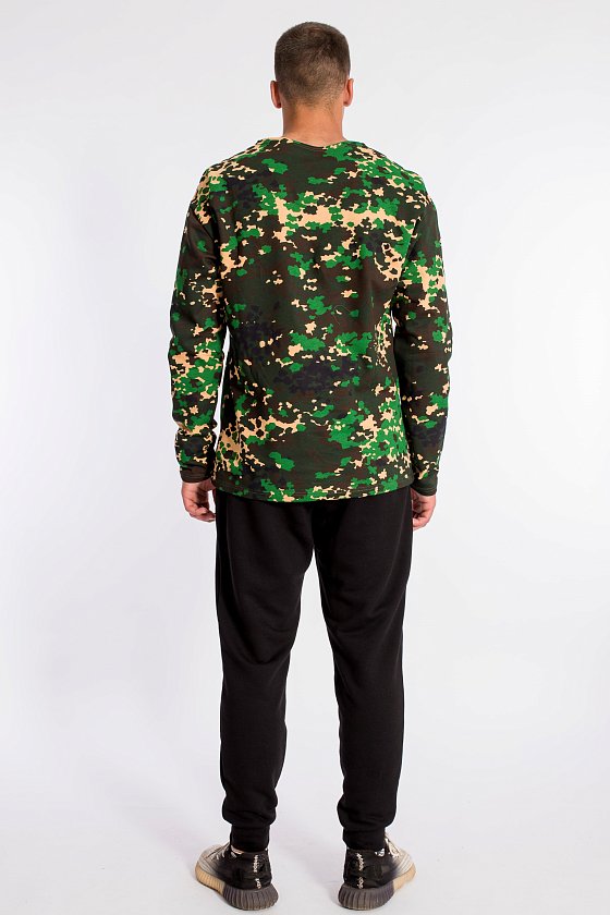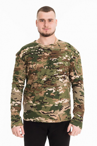 Тельняшка мужская выполнена из полотна с начёсом. Покрой свободный, горловина с круглым вырезом, длинный рукав.