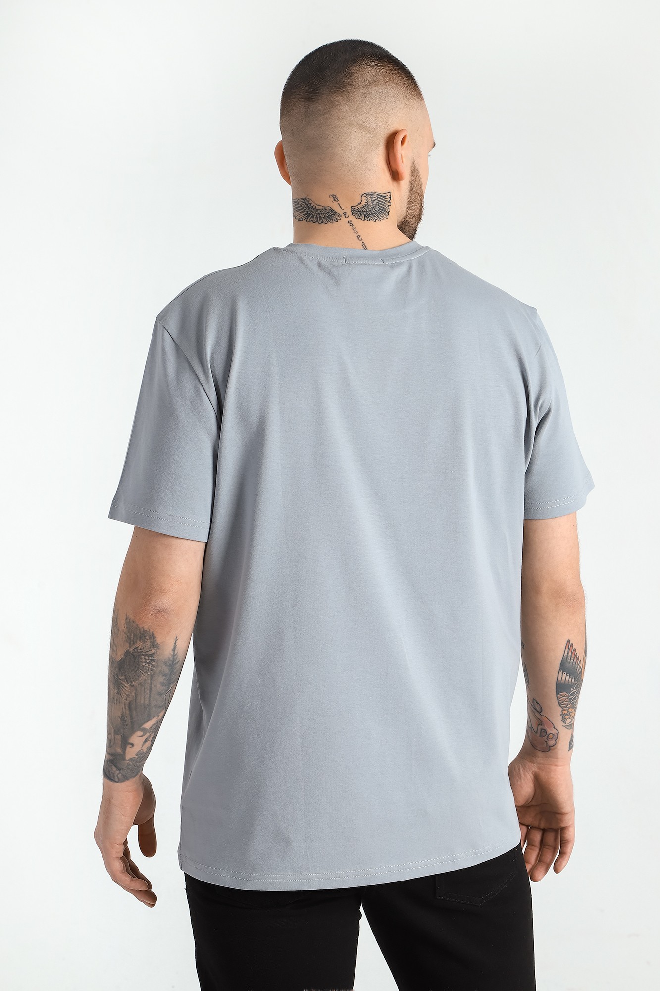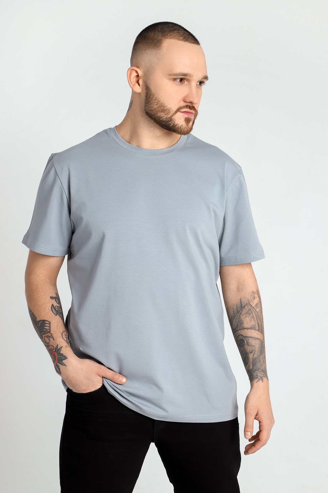 Базовая однотонная мужская футболка прямого силуэта без принта. Выполнена из трикотажного полотна: хлопкового с добавлением лайкры. Горловина округлой формы с усилителем горловины спинки.