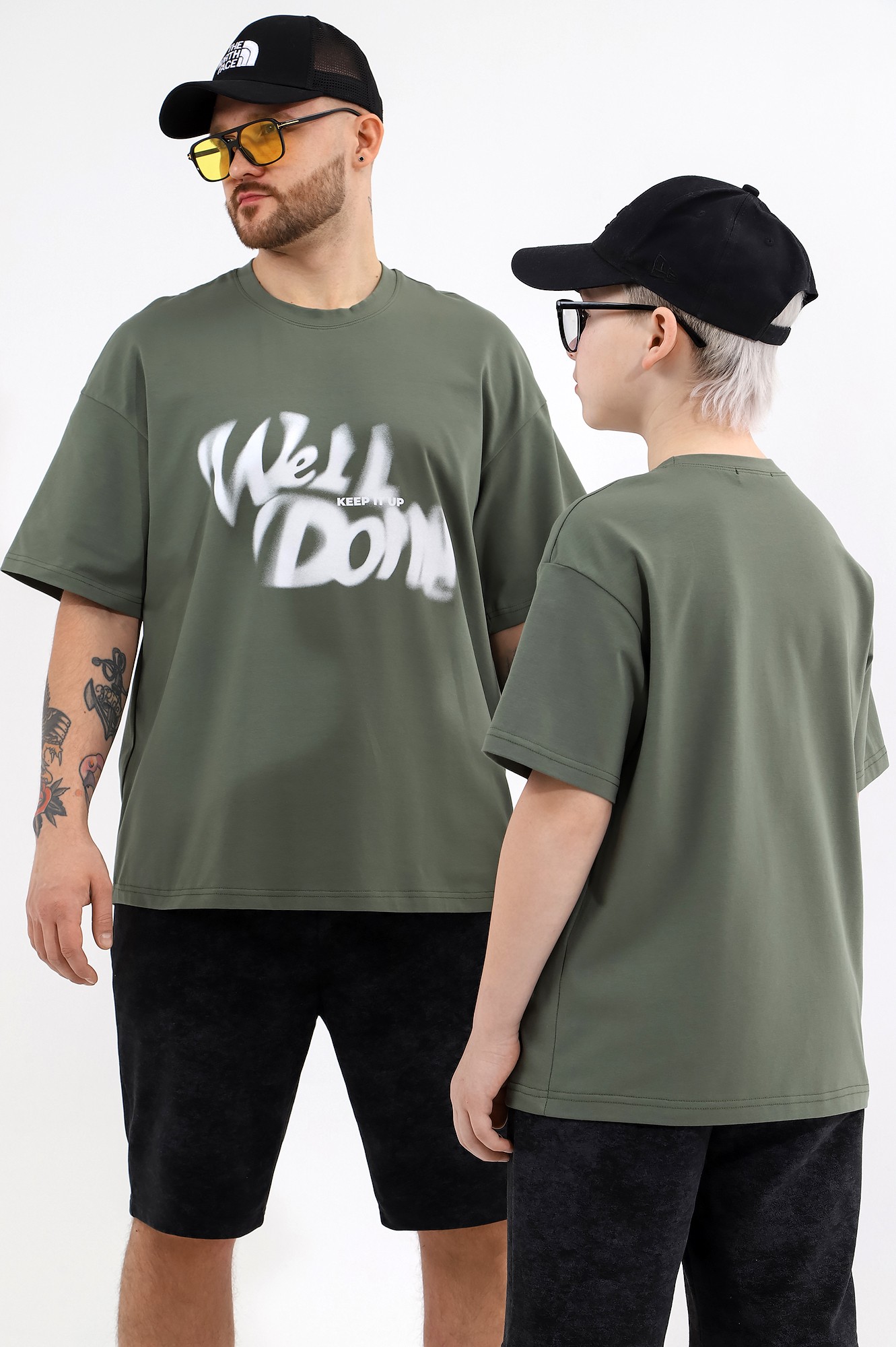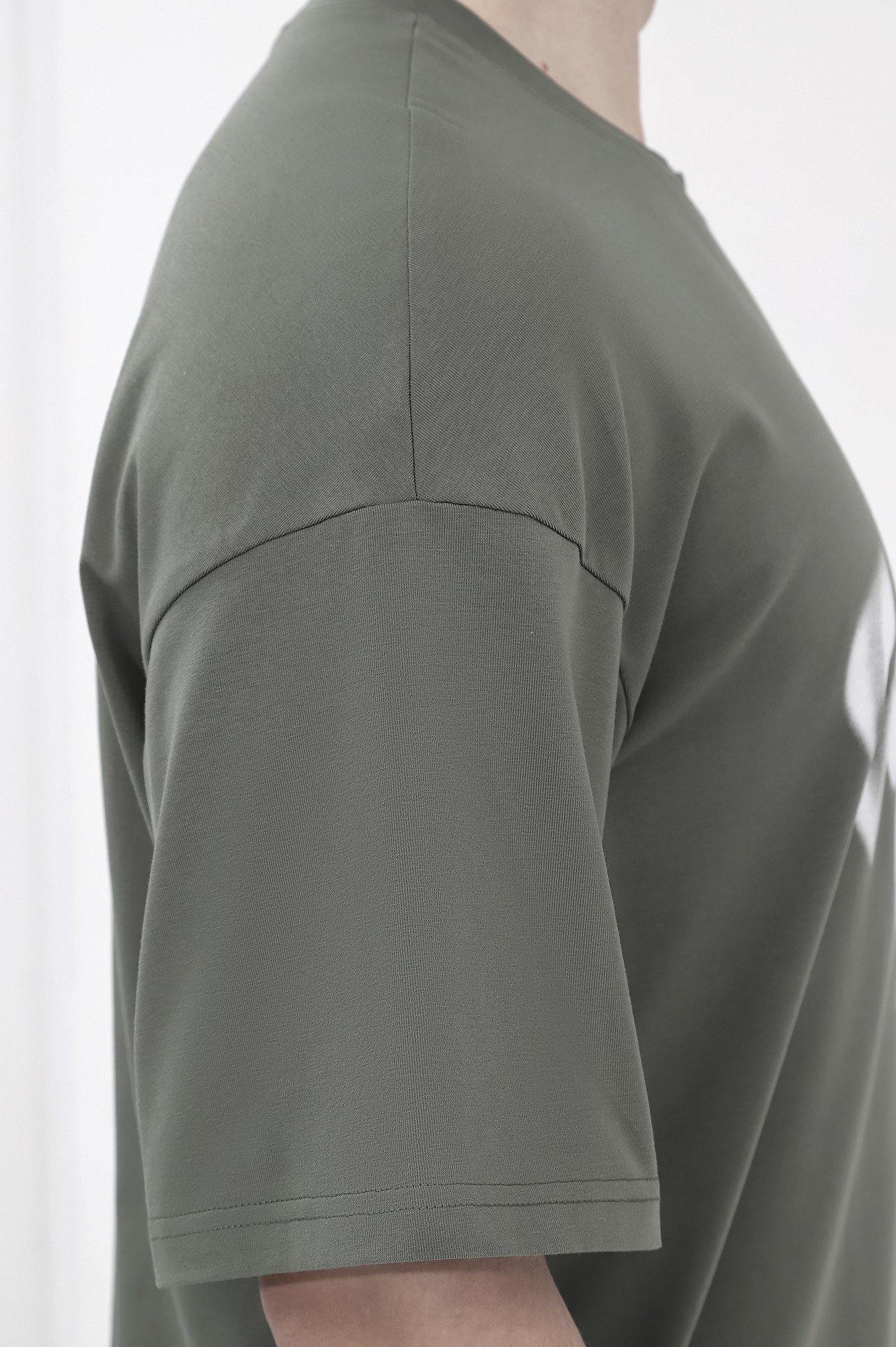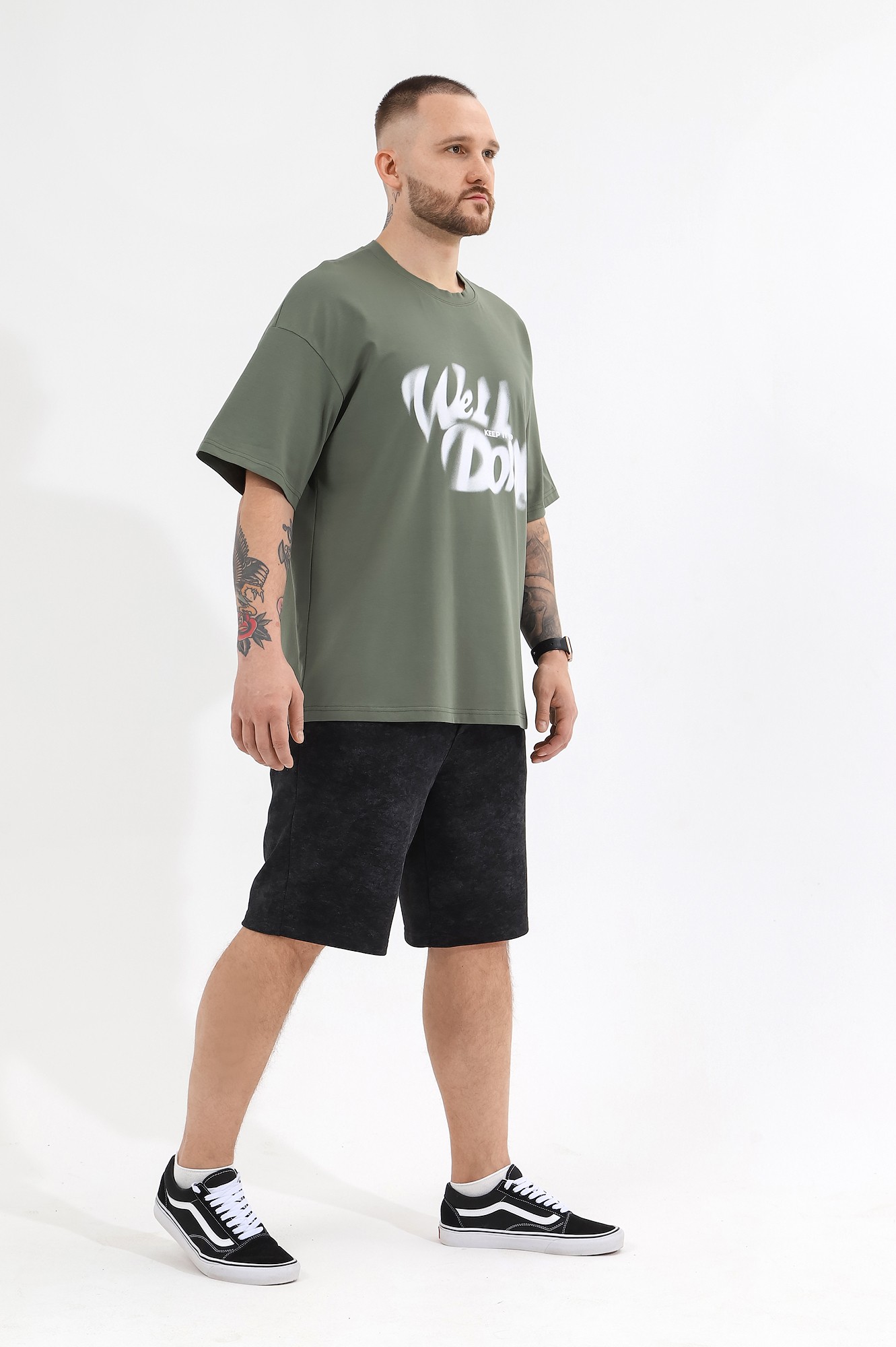 Футболка мужская оверсайз из трикотажного полотна: хлопкового с добавлением лайкры. Модель с принтом на переде, спущенной линией плеч, рукавами длиной до локтя.
