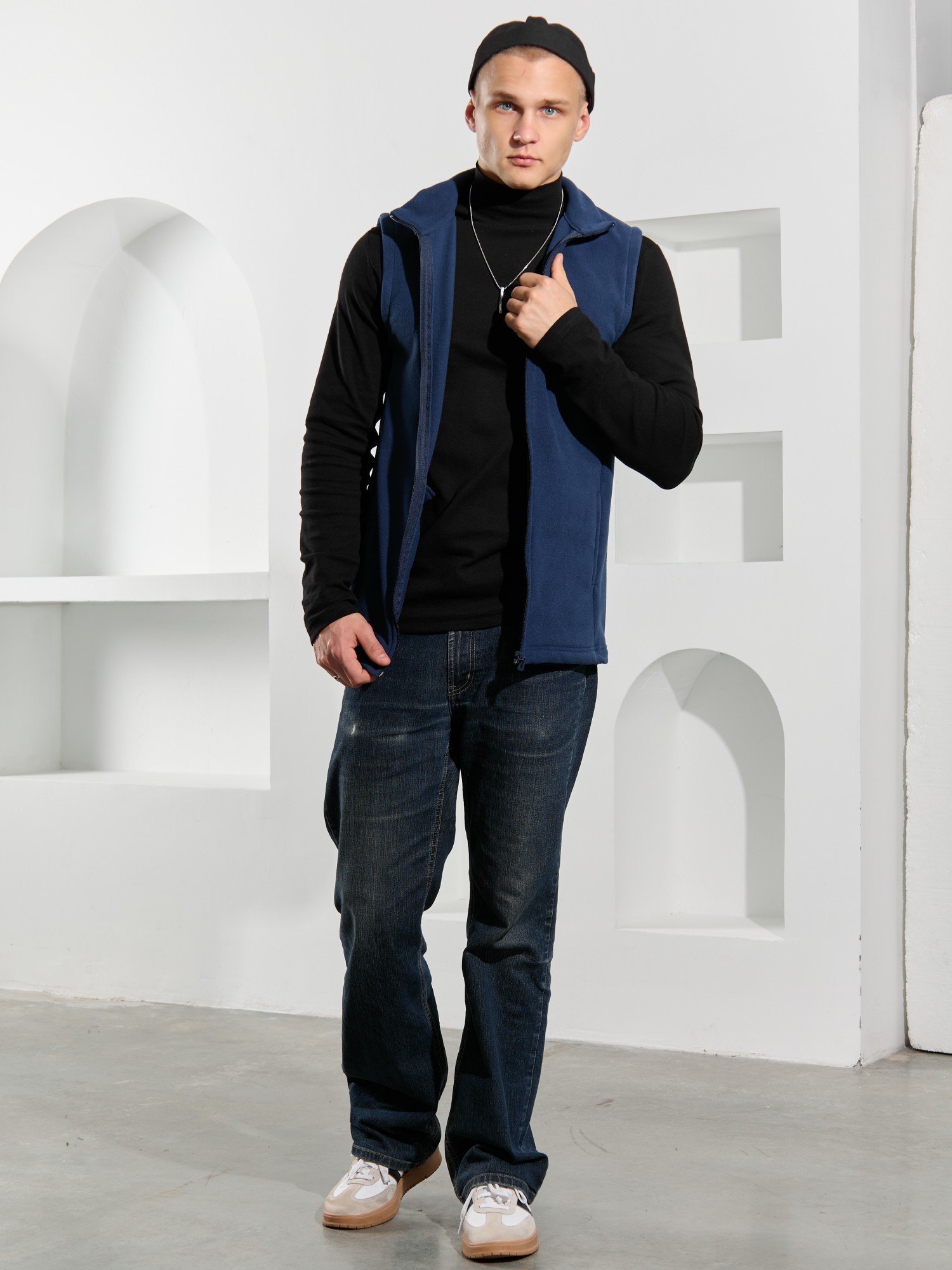 Жилет мужской из флиса, прилегающего силуэта, с воротником-стойкой , центральной боротовой застежкой на тесьму "молния" и вертикальными рельефами на полочках, в швах которых обработаны карманы. Проймы и низ изделия обработаны подгибкой. В нижней части левого бокового шва вставлен небольшой декоративный элемент из репсовой ленты.