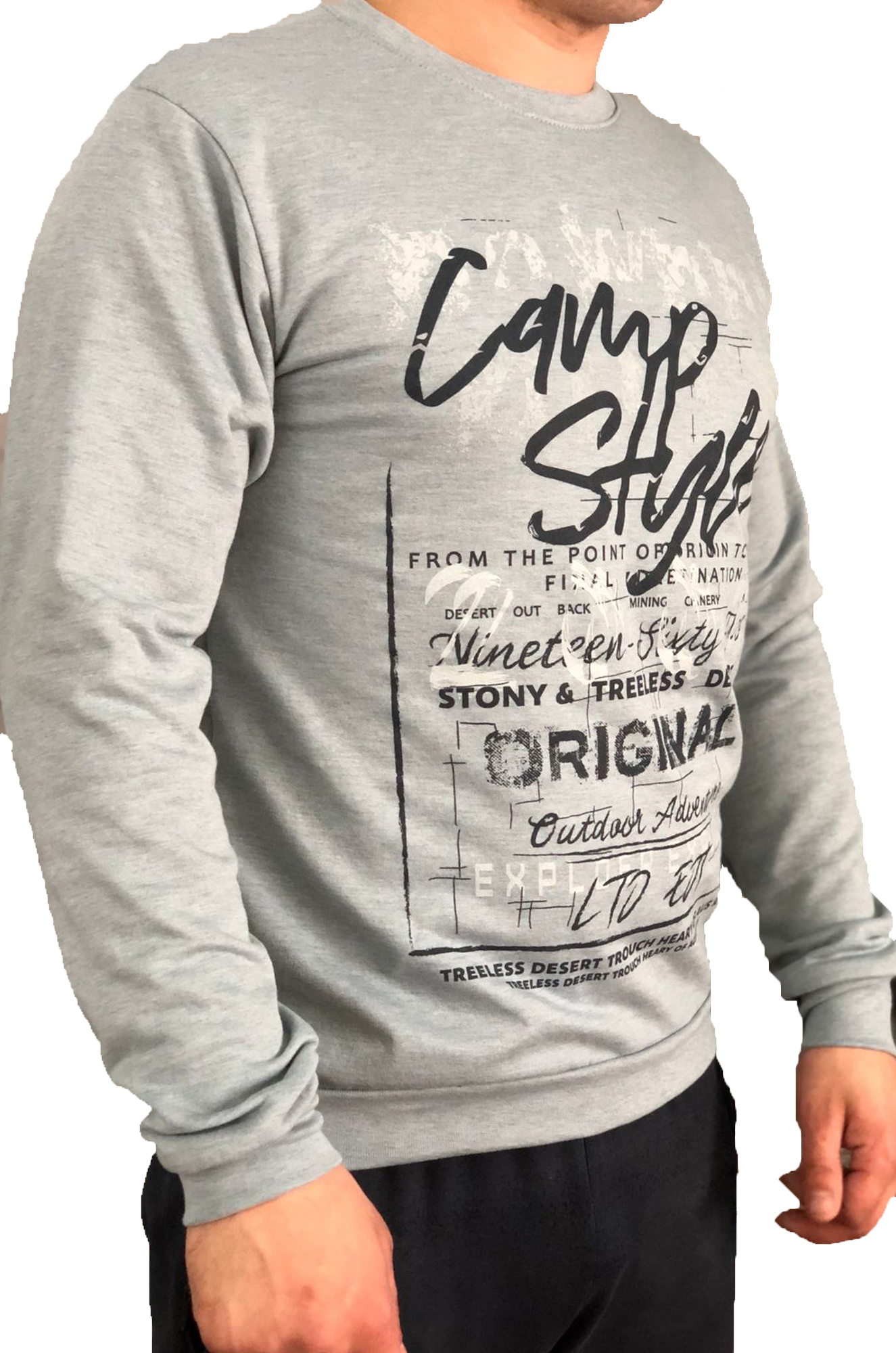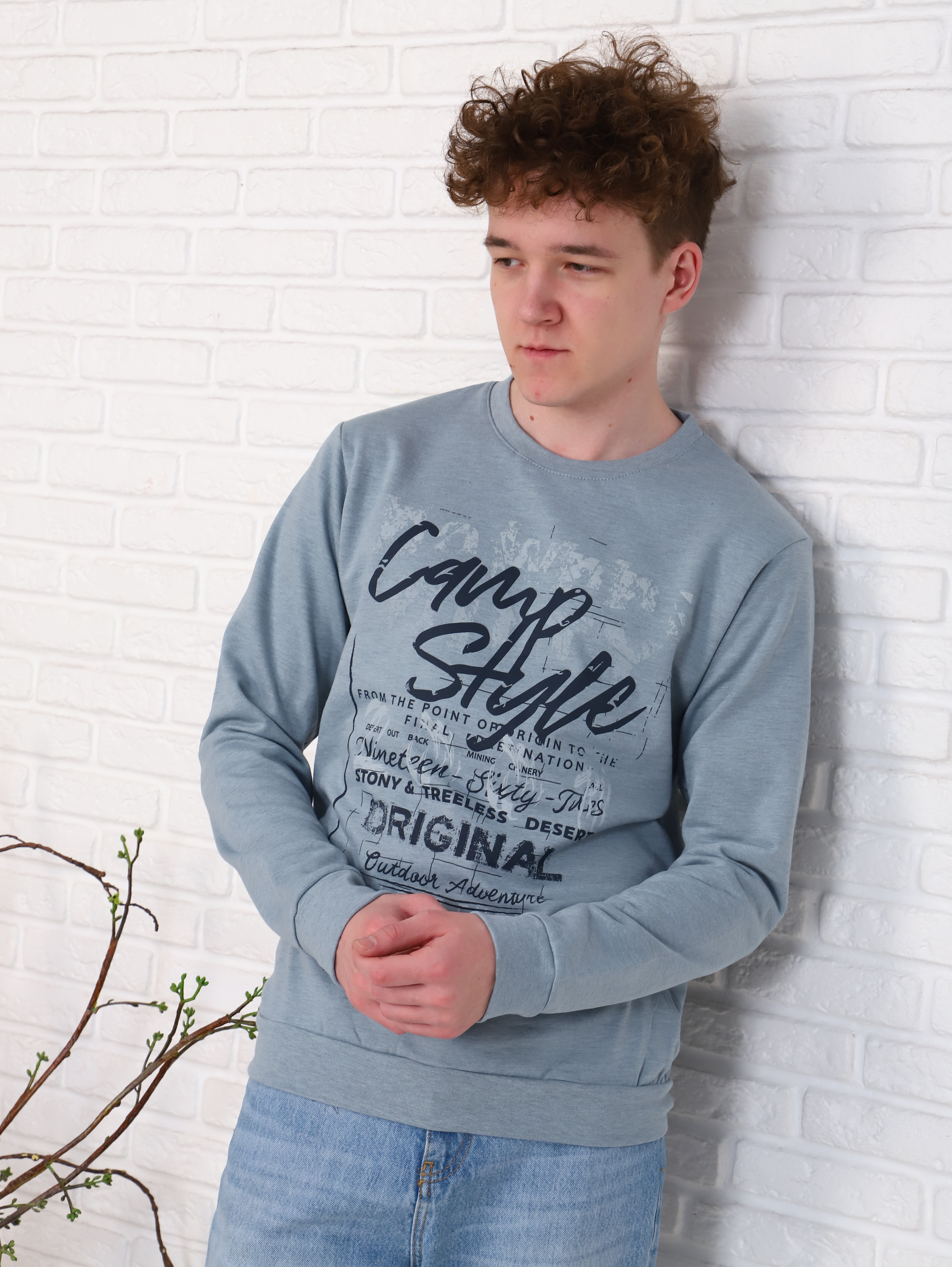 Стильная мужская толстовка-свитшот из облегчённого футера с микроначёсом. Классический округлый вырез горловины, рукава и низ изделия на манжетах, на полочке печатный принт. Модель отлично смотрится и с джинсами, и с классическими брюками. Идеальный вариант на каждый день.