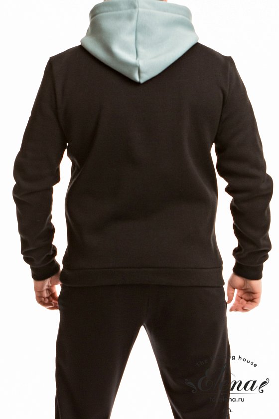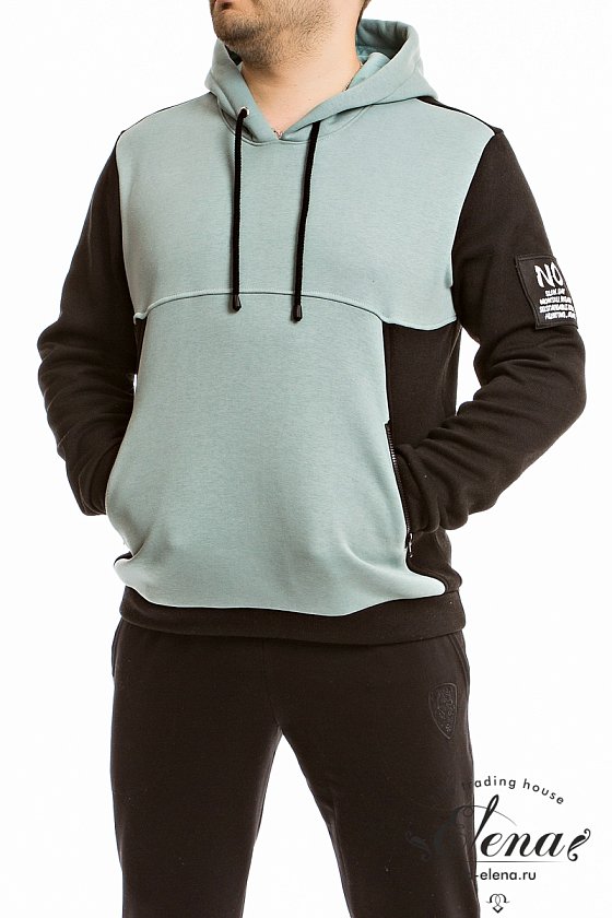 Толстовка из двух видов футера с начесом. С капюшоном и длинными рукавами на манжете. По бокам расположены два кармана на молнии, по низу притачной пояс. На левом рукаве нашивка.
