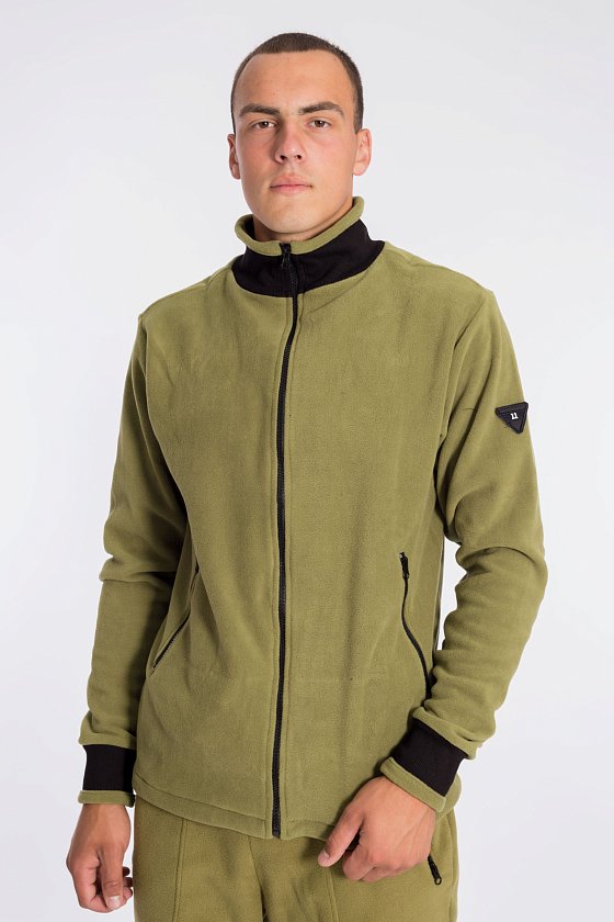 Толстовка выполнена из однотонного флиса. Спереди центральная застёжка на молнию. Толстовка с воротником-стойкой, втачными рукавами и карманами на молнии по бокам. На левом рукаве нашивка.