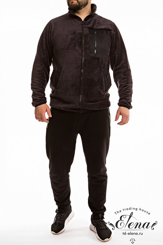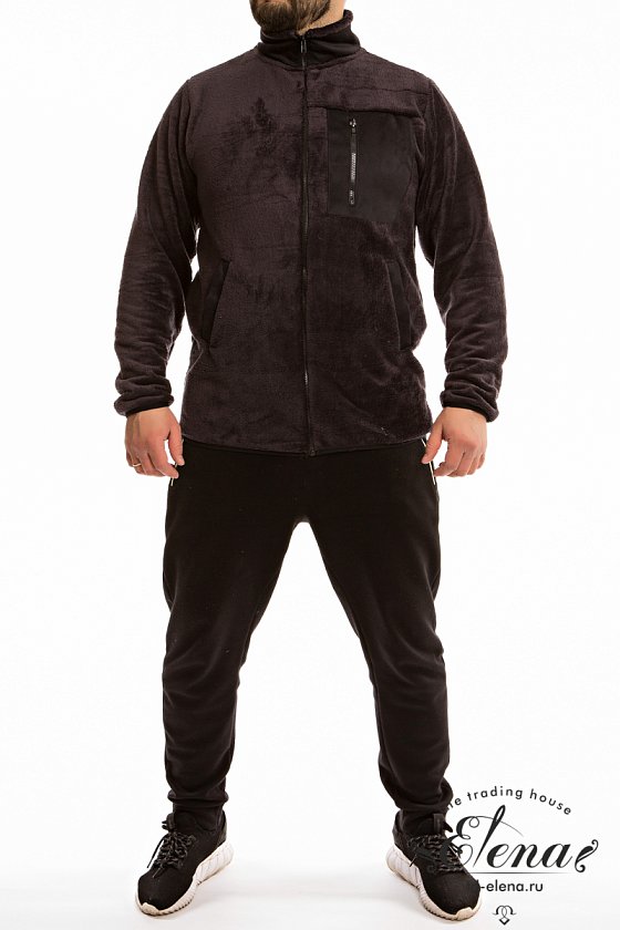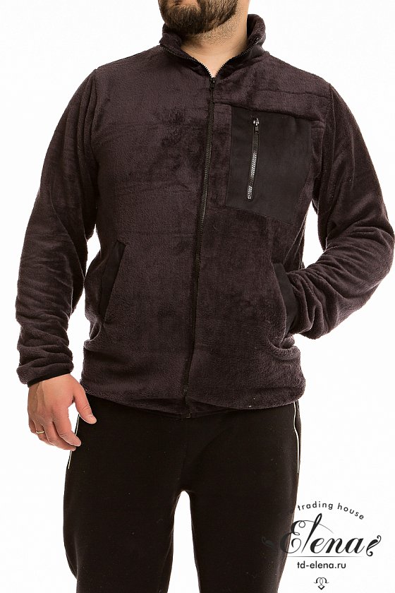 Толстовка из велсофта с застёжкой на молнию. С воротником стойкой, втачными рукавами и карманами по бокам. На воротнике, карманах и накладном нагрудном кармане с молнией в качестве отделки используется искусственная замша. Низ рукавов и изделия окантован эластичной бейкой.