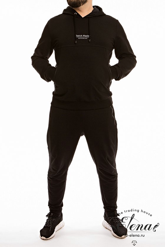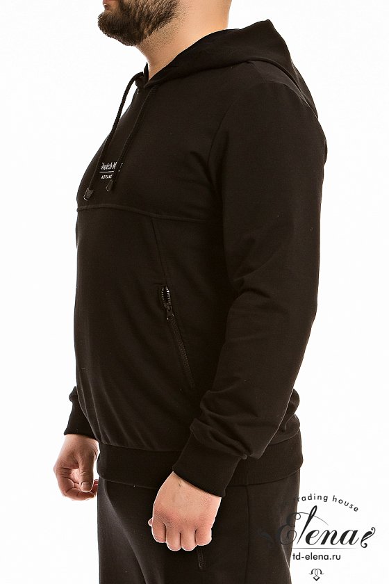 Мужская толстовка из футера петли с лайкрой черного цвета с капюшоном и длинными рукавами на манжетах обеспечивает комфорт в прохладную погоду. По бокам расположены два кармана на молнии, что позволяет удобно хранить мелочи или согреть руки. По низу толстовки притачной пояс обеспечивает хорошую посадку.