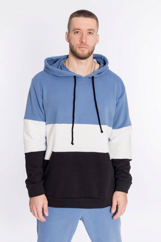 Мужская толстовка выполнена из полотна футер трёхнитка (воздушка). Силуэт толстовки свободный, ширина капюшона регулируется шнуром. Линия плеча спущена, длинные рукава заканчиваются манжетами. Спереди располагается карман-кенгуру.