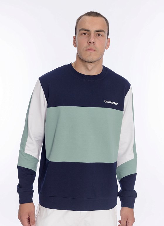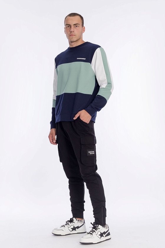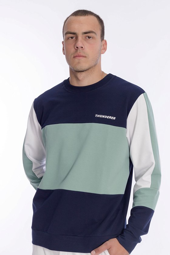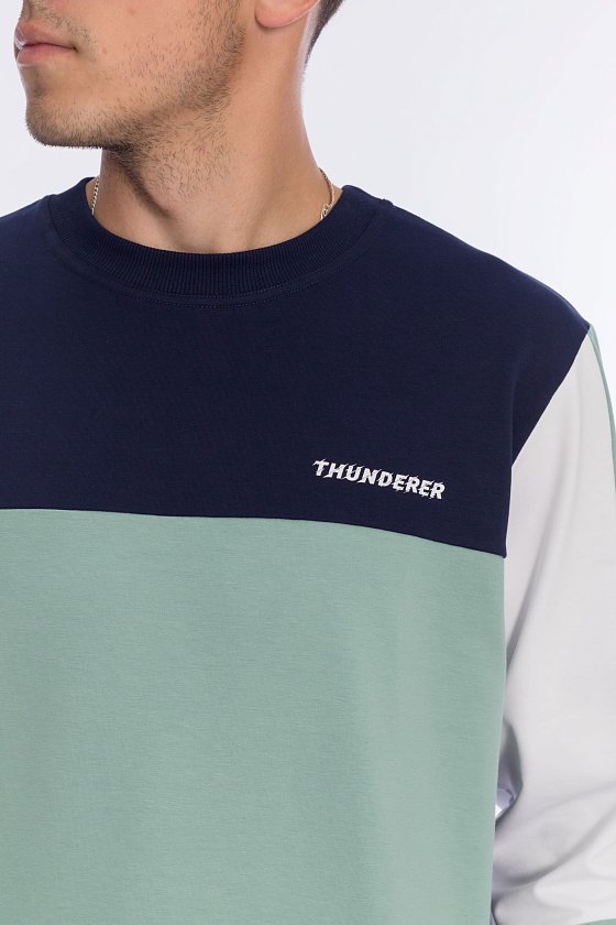 Толстовка выполнена из футер петли с лайкрой. Силуэт толстовки свободный, яркость модели придает сочетание контрастных цветов, спереди расположен небольшой принт. Манжеты и пояс толстовки выполнены из основного полотна, а планка круглого выреза горловины из кашкорсе.