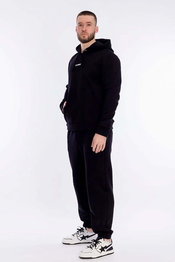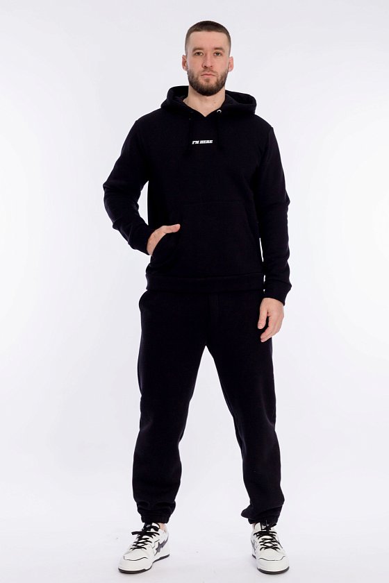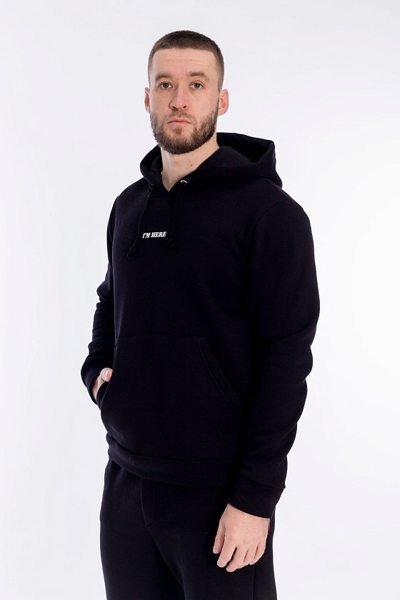 Мужская толстовка выполнена из футера с начесом (трёхнитка). Толстовка с капюшоном со шнуром и длинными рукавами. Спереди нанесён принт и расположен карман-кенгуру. Манжеты рукавов и притачной низ изделия из основного полотна.