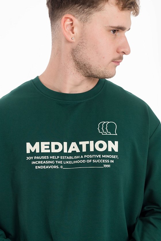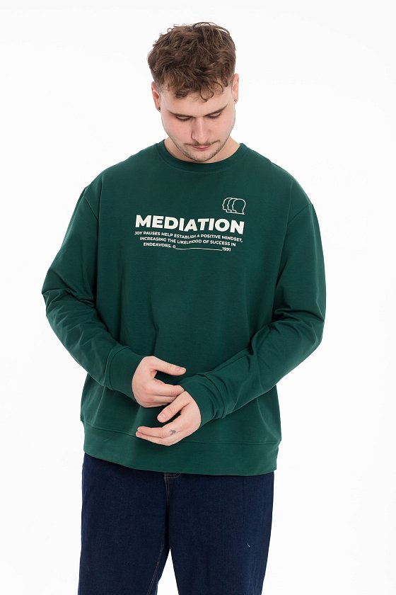 Мужская толстовка выполнена из однотонного футера с лайкрой, мягкого и комфортного для повседневной носки. Модель имеет длинные слегка приспущенные рукава, что обеспечивает свободную посадку и удобство в движении. Горловина оформлена притачной планкой, манжеты и пояс выполнены в тон основному материалу, создавая аккуратный и завершённый вид. Спереди расположен стильный принт, который добавляет изделию современный характер. Толстовка отлично подходит для прогулок, отдыха и повседневного гардероба.