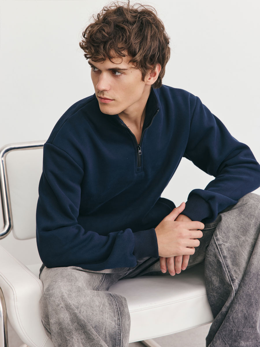 Мужская толстовка из футера 3-х нитка диагональ микро-начес с "эффектом велюра", с втачным рукавом и воротником-стойкой. На полочке 2 прорезных кармана с листочками. Центральная застежка на короткую молнию.  Манжеты и пояс из кашкорсе.