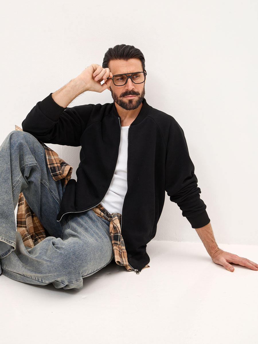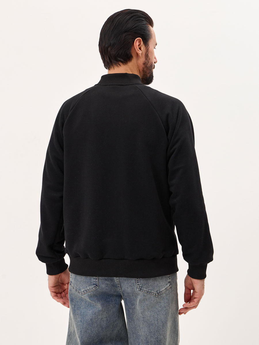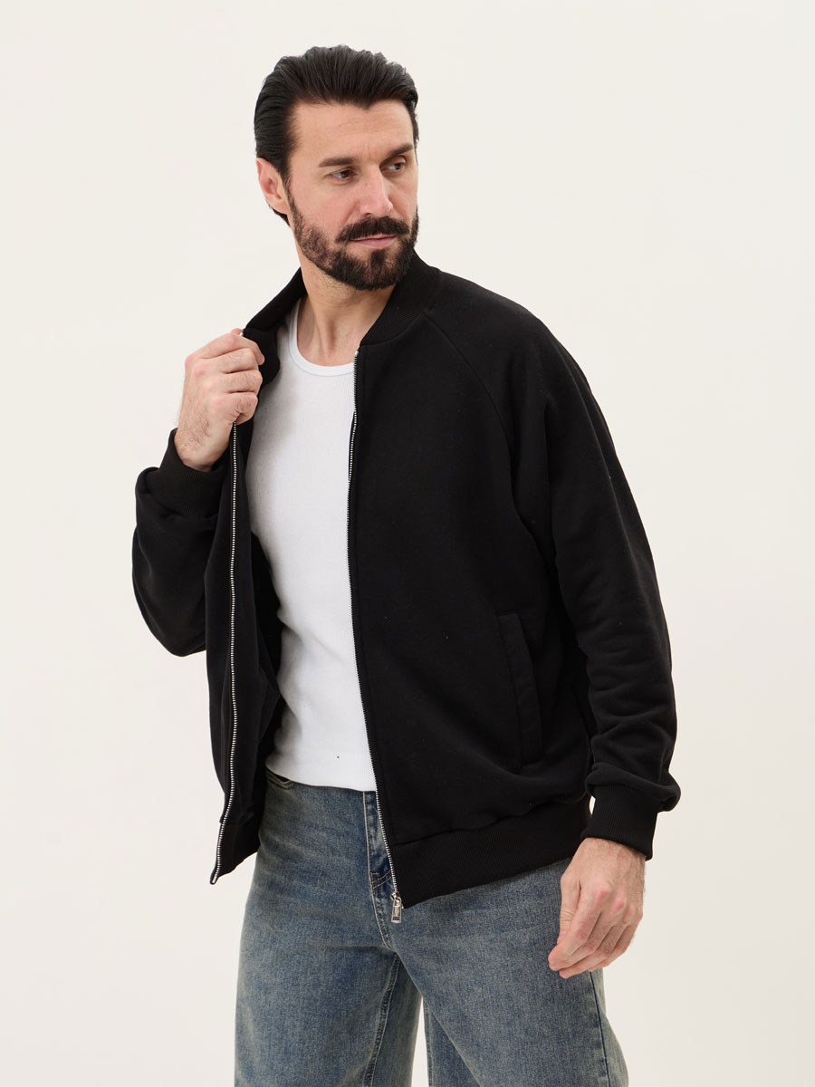 Мужской бомбер на молнии, с рукавом покроя реглан и втачным воротником-стойкой. На полочке 2 прорезных кармана с листочками. Манжеты, пояс, воротник из кашкорсе. Центральная застежка на разъёмную молнию до воротника.