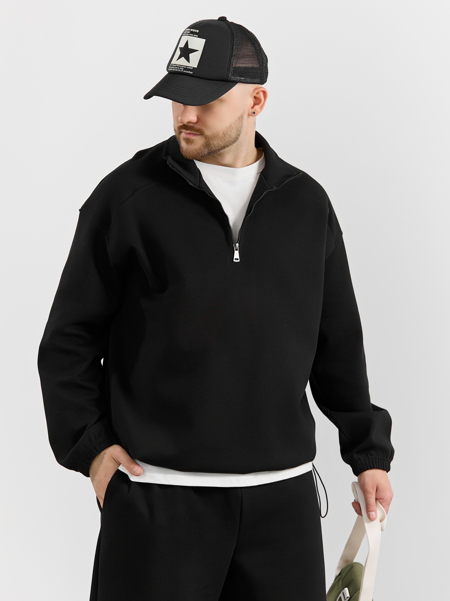 Толстовка мужская из трикотажного полотна "интерлок-пике". Толстовка свободного покроя, с длинными втачными рукавами, заниженными проймами и воротником-стойкой. Полочка с кокетками, с неразъемной застежкой "молния", обработанной в рамке. Нижние срезы рукавов обработаны с эластичной тесьмой, нижний срез изделия - подгибкой, с эластичным шнуром и фиксаторлм для регулировки ширины изделия на этом участке.