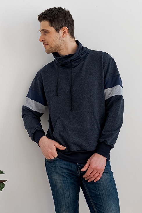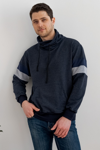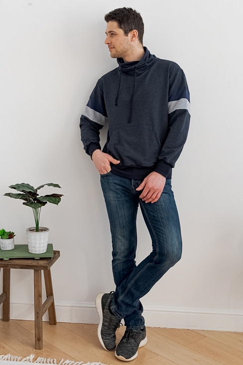Толстовка мужская из футера Оскар индиго макси из комбинированной ткани. Воротник-хомут, карман-кенгуру.
