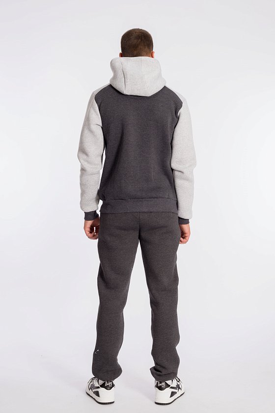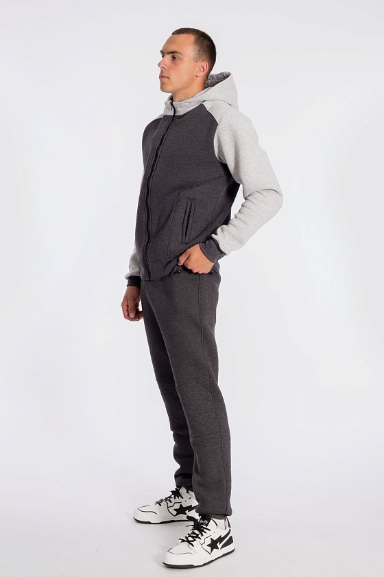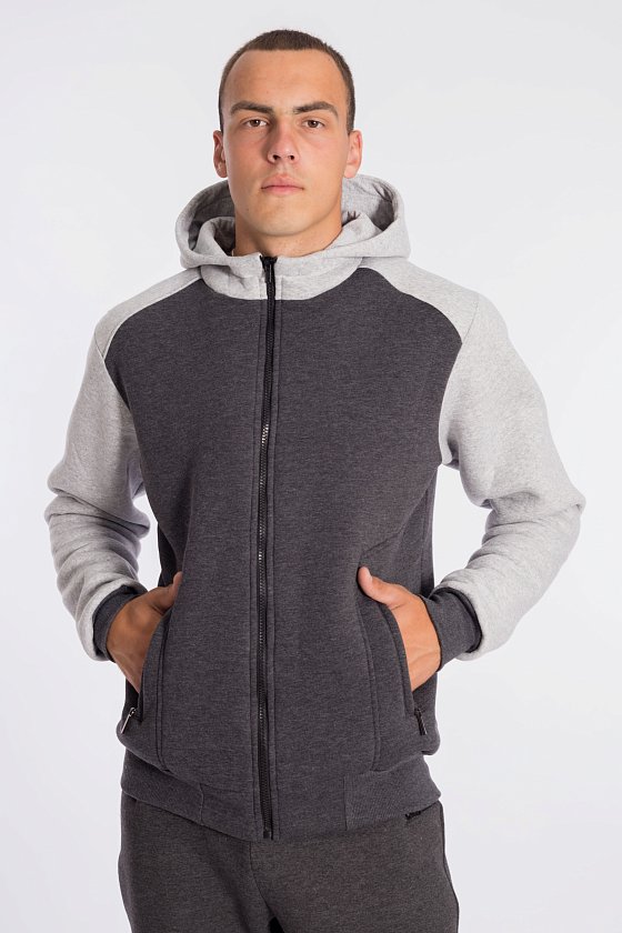 Толстовка мужская с начёсом, комбинирована из полотен двух цветов. Капюшон с воротником-стойкой, центральная застёжка и прорезные карманы по бокам на молнии.
