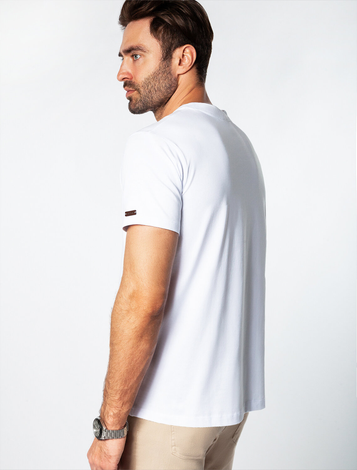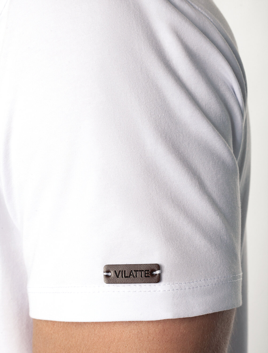 Принт выполнен красками с устойчивым покрытием. Футболка выполнена из премиального хлопка. Особым преимуществом является наличие эластана в составе изделия. Очень приятная на ощупь и комфортная при носке, футболка сохранит свой безупречный внешний вид в течении долгого времени. Модель дополнена нашивкой из эко-кожи с логотипом VILATTE.