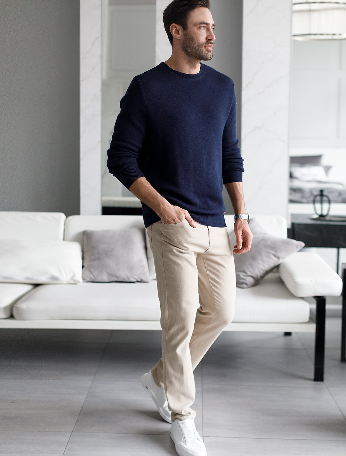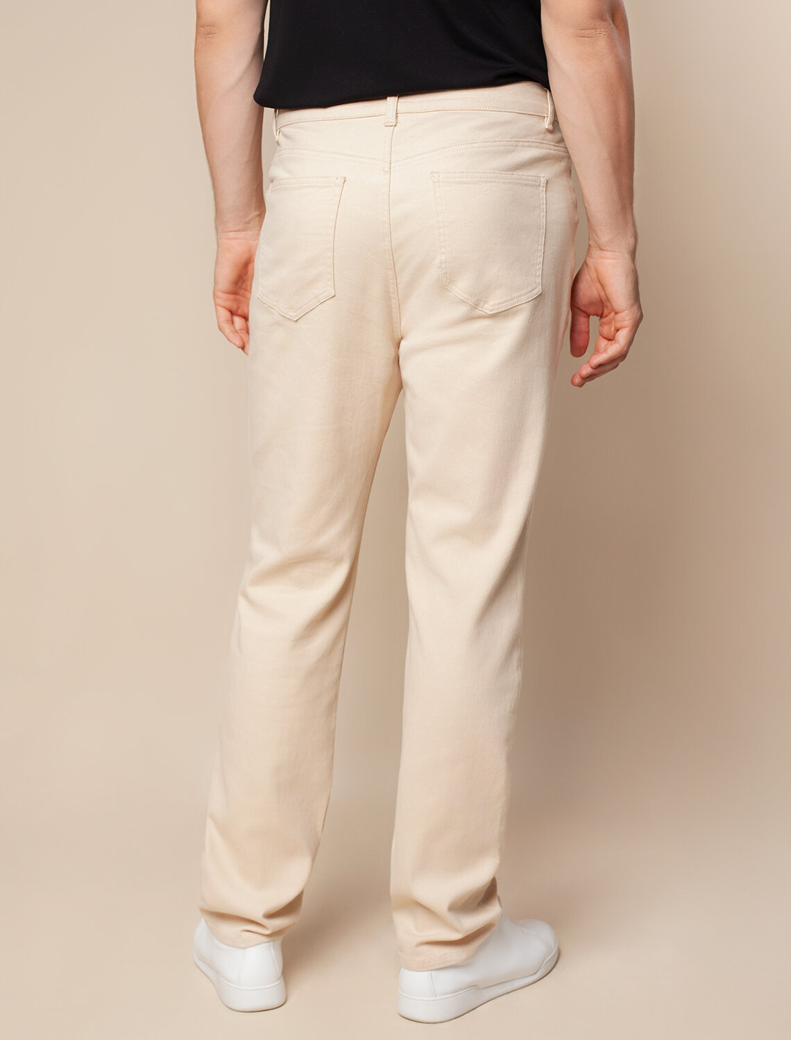 Бежевые брюки, слегка зауженные к низу, выполнили из 100% хлопкового денима. Изделие комфортно садится по фигуре, обеспечивая свободу движений. Легко сочетается со всеми цветами одежды. Модель дополнили высококачественной фурнитурой бренда.