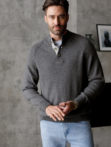 Свитер из теплой пряжи с шерстью с застежкой на акцентные черепаховые пуговицы. Внутри стойки контрастная пряжа, с помощью пуговиц можно регулировать высоту воротника и носить свитер как джемпер. Гармонично дополнит как повседневный образ, так и нестрогий офисный комплект, с рубашками, футболками или водолазкой. Модель дополнена фирменным логотипом бренда.