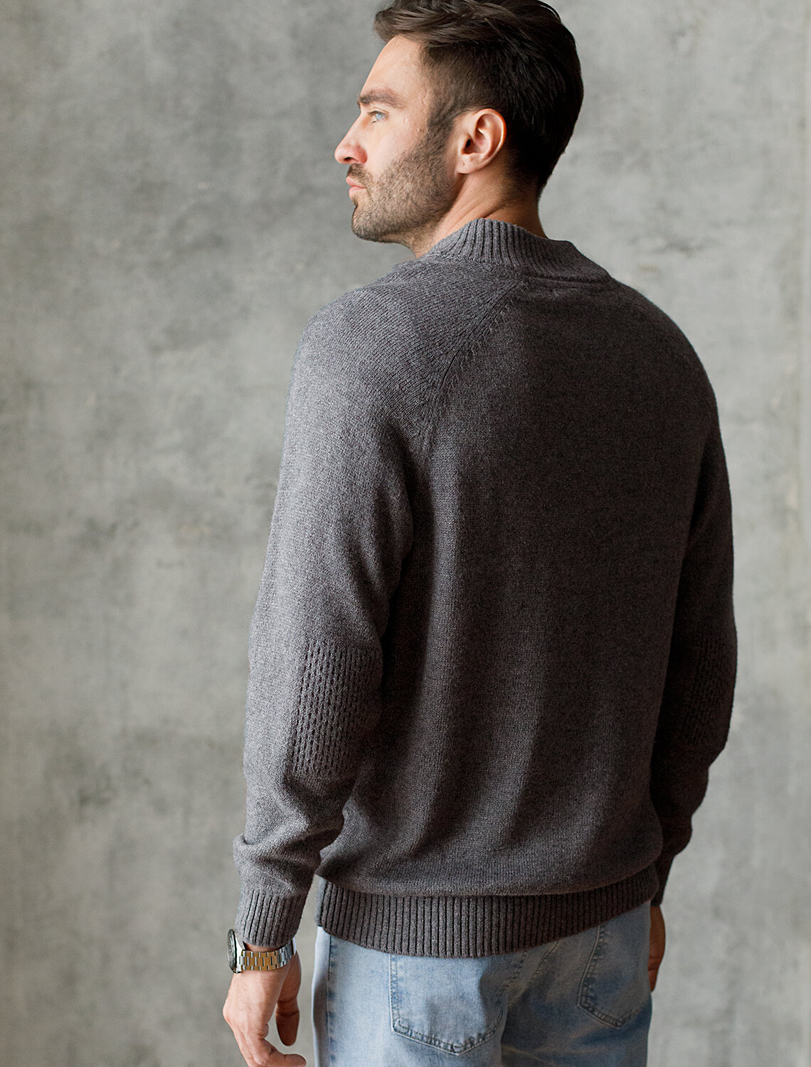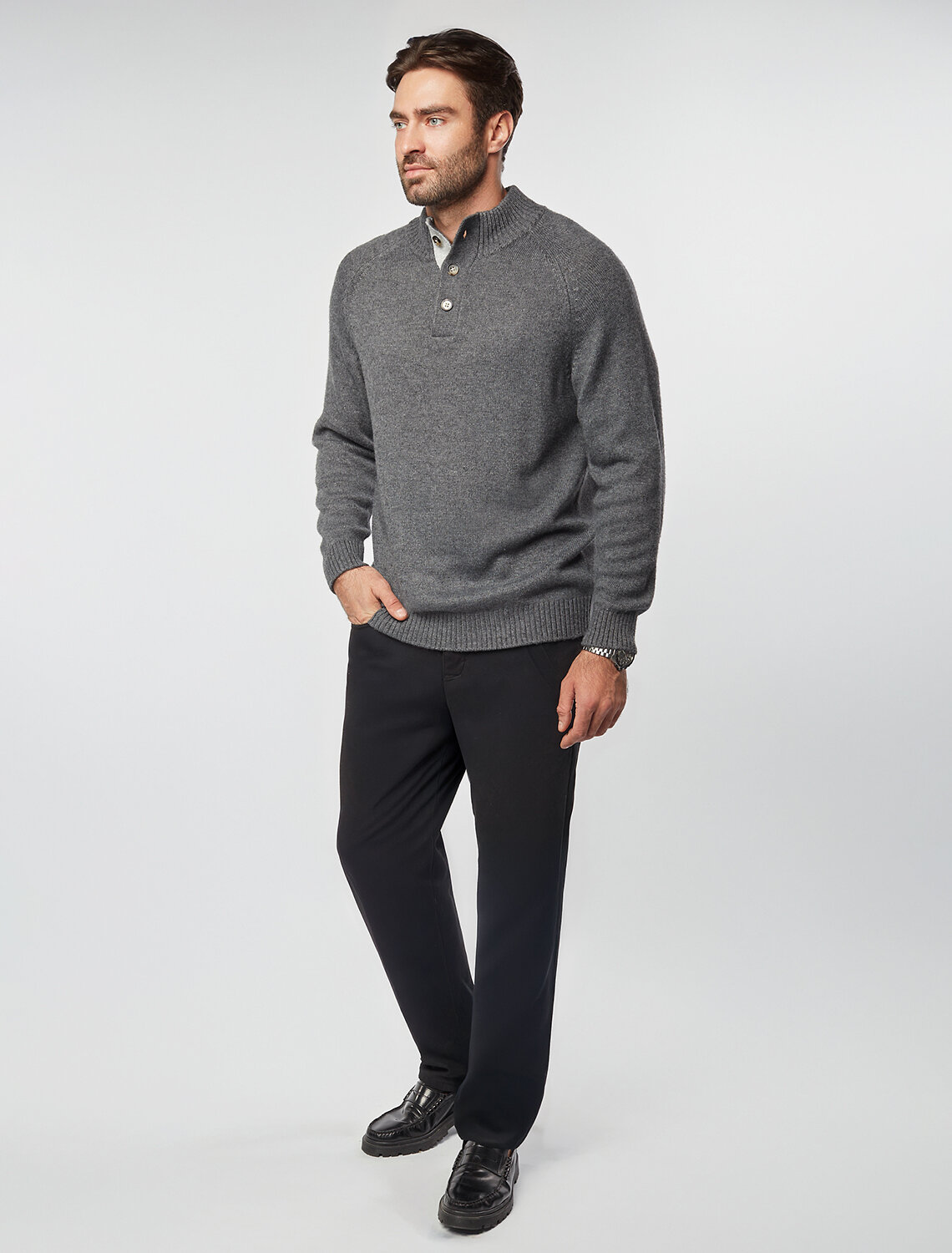 Свитер плотной вязки с застежкой на акцентные черепаховые пуговицы. Модель выполнена из теплой пряжи с шерстью. Внутри стойки контрастная пряжа, с помощью пуговиц можно регулировать высоту воротника и носить свитер как джемпер. Гармонично дополнит как повседневный образ, так и нестрогий офисный комплект, с рубашками, футболками или водолазкой. Модель дополнена фирменным логотипом бренда.