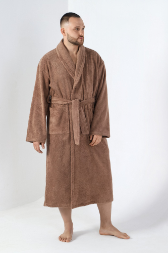 Мужской халат из двустороннего махрового хлопкового полотна. Модель на запах, с поясом в шлёвках, с боковыми карманами, с воротником "шаль", с петлей-вешалкой по горловине спинки.
