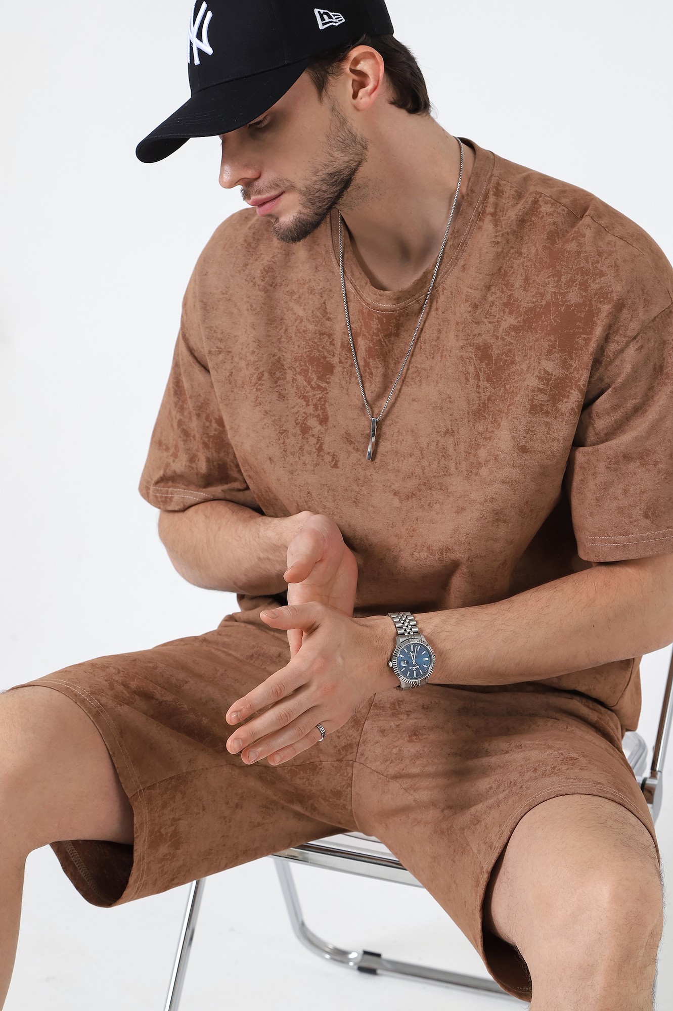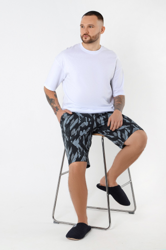 Костюм мужской, состоящий из футболки и шорт. Футболка - свободного покроя, короткими втачными рукавами и горловиной овальной формы, обработанной втачной планкой. По шву втачивания планки настрочена двойная отделочная строчка. Шорты - удлиненные, с карманами в боковых швах, на притачном поясе с эластичной тесьмой внутри.
