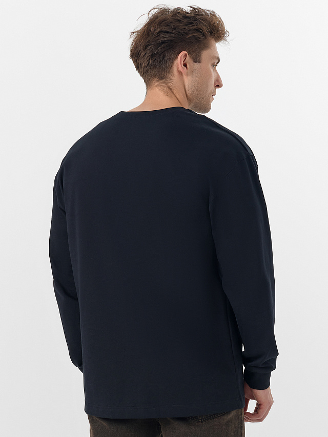 Черный оверсайз лонгслив создает современный и расслабленный образ. Его свободный крой со слегка спущенным плечом обеспечивает комфорт и полную свободу движений.