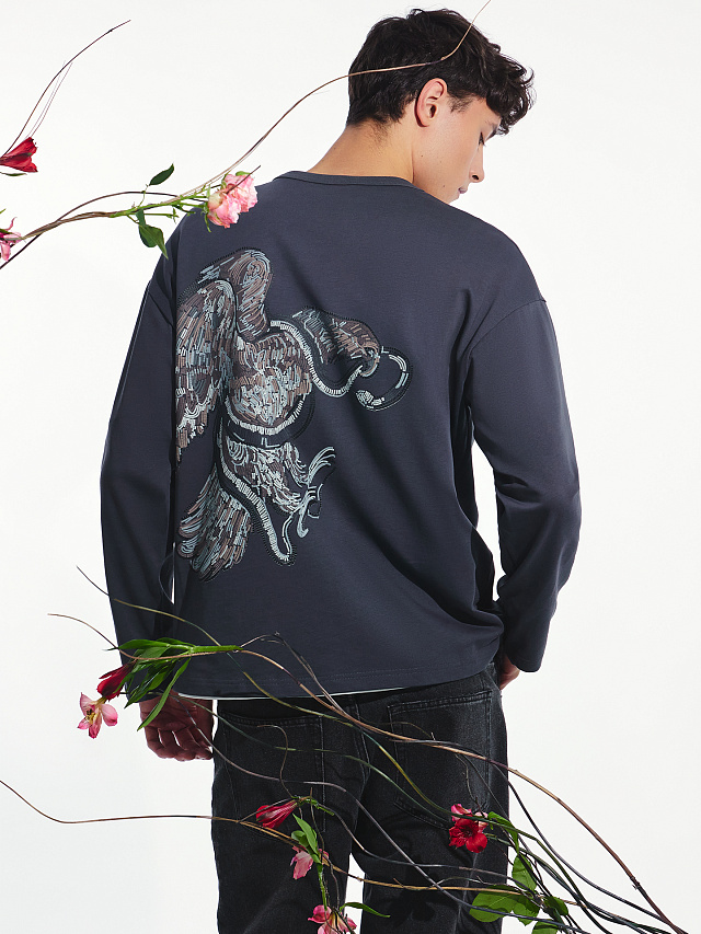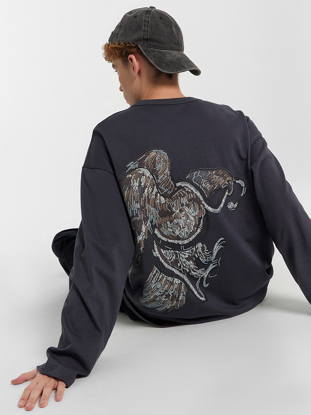 Лонгслив мужской серый с аппликацией на спинке