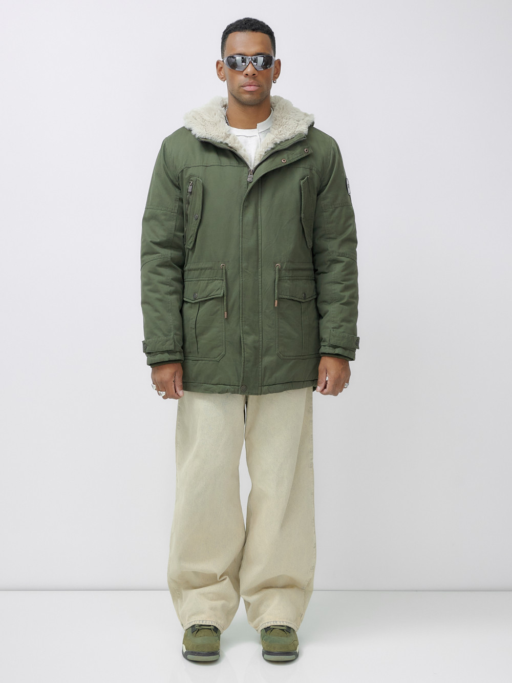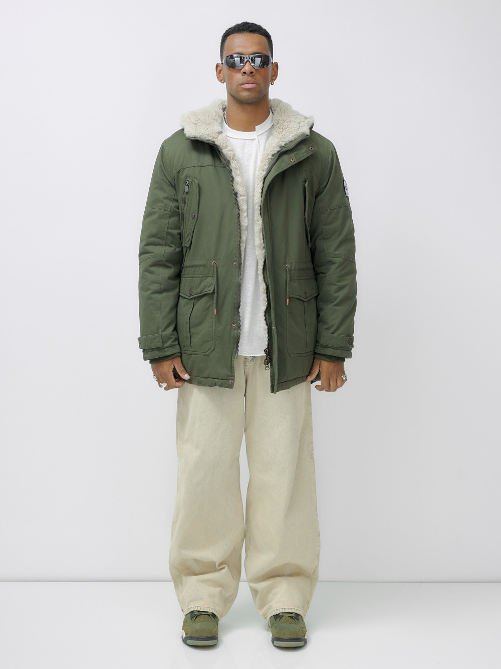 Парка мужская зимняя удлиненная с мехом цвета хаки 2606Kh