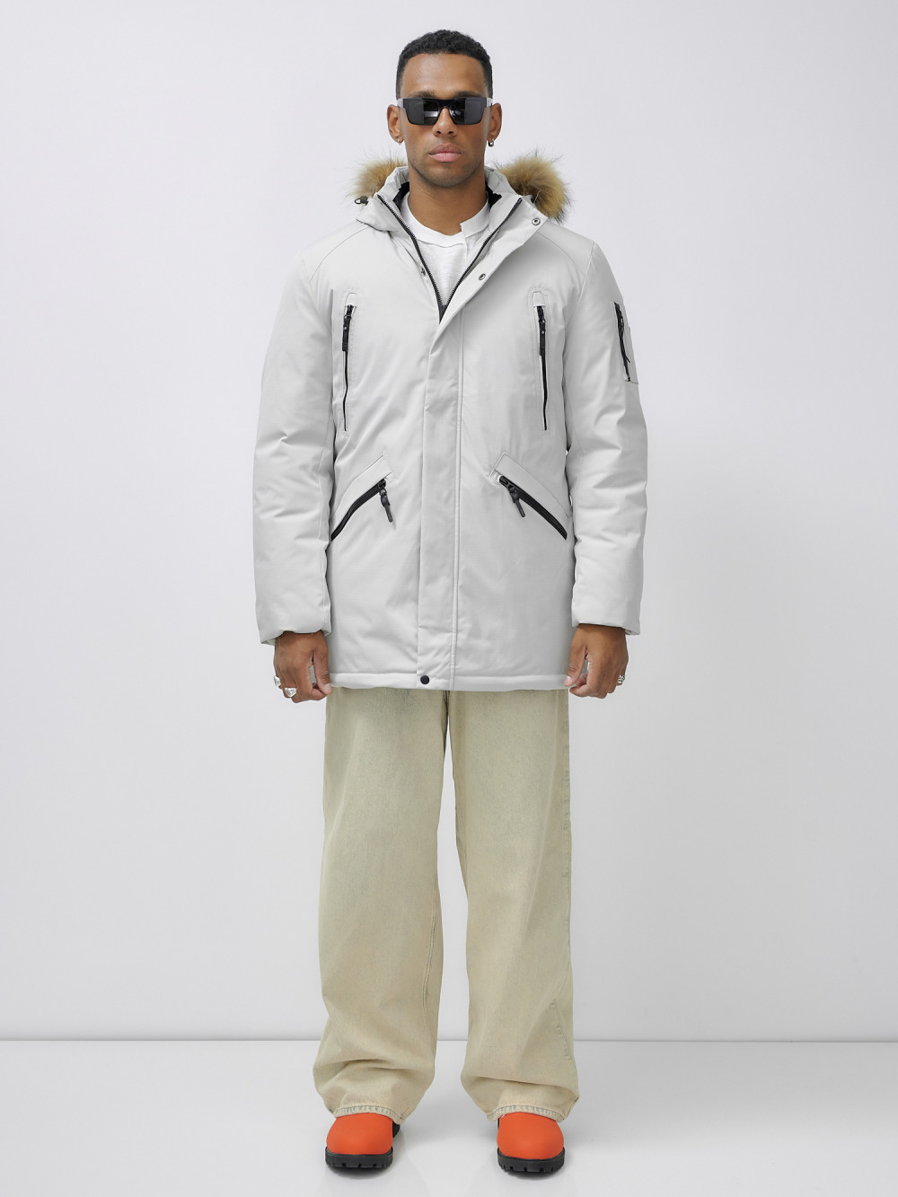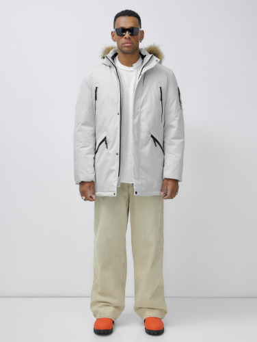Парка мужская зимняя удлиненная с мехом светло-серого цвета 606_1SS