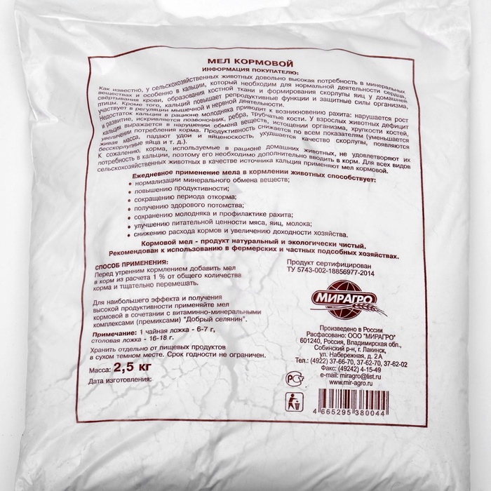 * снижению расходов кормов и увеличению доходности хозяйства.Мел кормовой – продукт натуральный и экологически чистый. Рекомендован к использованию в фермерских и частных подсобных хозяйствах.