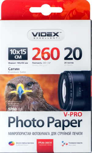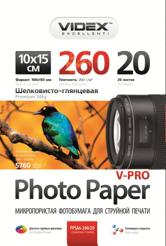 Фотобумага Videx 10x15 260г/м2 шелковисто-глянцевая PPSA6-260/20л.