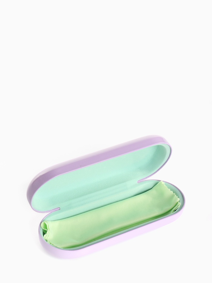 Жесткий футляр для очков с застежкой "хлопушка", длиной 16 см в стильном сиреневом исполнении — идеальный выбор для девочки. Изготовлен из искусственной кожи, он надежно защитит любимые очки от повреждений и загрязнений. Компактный и практичный, этот футляр станет ярким дополнением к любому аксессуару.