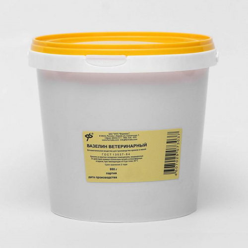 «Вазелин ветеринарный» представляет собой однородное без комков мазеобразное вещество от белого до светло-коричневого цвета. Назначение: Устранение сухости и защита кожи сосков вымени животных от внешних раздражителей. Смазывание сосков вымени животных для предотвращения последствий машинного доения. Смазывание рук дояров для облегчения процесса ручного доения животных. Использование в качестве основы при изготовлении мазей и паст для животных. Фармакологические свойства: оказывает смягчающее действие на кожу и способствует снижению зуда и шелушения за счет компенсации недостаточного количества жировой смазки и размягчения ороговевших клеток; образует на поверхности кожи сосков тонкую защитную плёнку, которая способствует закрытию соскового канала после доения и предохраняет кожу сосков вымени от внешних раздражителей; имеет жирную консистенцию, обеспечивающую хороший скользящий эффект при доении; может использоваться до доения, так как не содержит ингибирующих веществ; не обладает местно-раздражающим, кожно-резорбтивным и сенсибилизирующим действием. Состав продукта: Глубокоочищенный продукт, получаемый сплавлением церезина, парафина, петролатума и нефтяных масел.