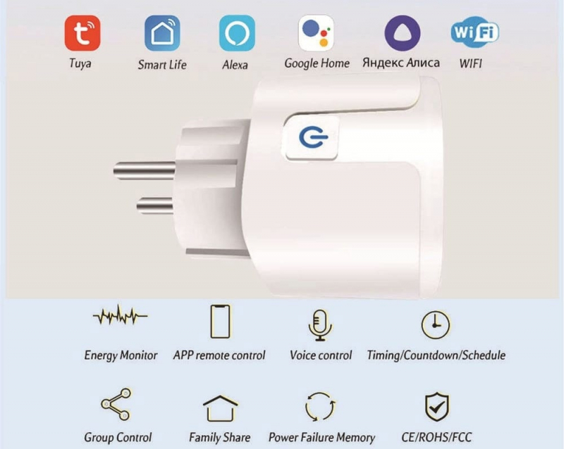 - Одна из лучших умных WiFi розеток – Tuya, с голосовым управлением.