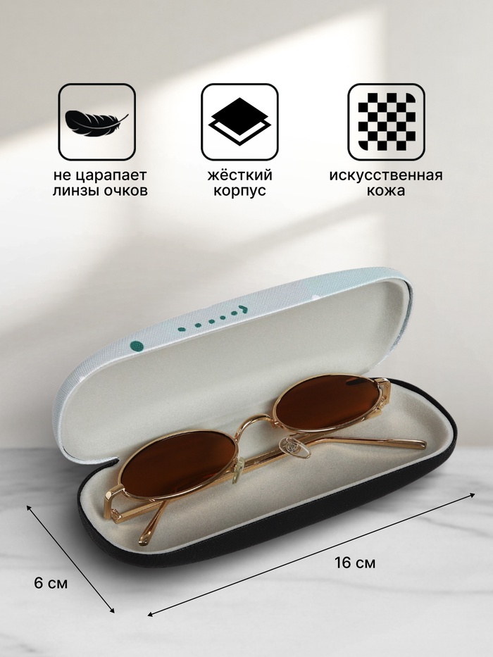 Футляр для очков — это необходимый аксессуар как для взрослого, так и для ребёнка, так как он поможет сохранить ваши очки в идеальном состоянии. Иногда возникают неудобства с ношением солнечных очков и очков для зрения одновременно, в этом случае нам пригодится специальный футляр для хранения очков. Футляр имеет жёсткий корпус, который защитит стёкла от пыли и предотвратит появление царапин и повреждений. Этот чехол – унисекс, он идеально подходит как для мужского, так и для женского стиля. Наш чехол для очков выполнен из качественной экокожи, которая обеспечивает надёжную защиту и долгий срок службы. Пенал имеет хлопушку, благодаря которой его можно легко и удобно закрыть. Этот чехол имеет горизонтальную форму, что позволяет легко и удобно хранить в нем очки. Также он обладает отличным солнцезащитным эффектом, благодаря специальному материалу, который не пропускает ультрафиолетовые лучи. Очечник из искусственной кожи подчёркивает индивидуальность благодаря своей яркой фактуре и стильному принту. Его голубой оттенок подойдёт каждому, а рисунок будет поднимать настроение и мальчикам, и девочкам. Футляр имеет удобную форму, которая позволяет легко и компактно хранить очки в сумке или кармане, не занимая много места. Жёсткий футляр — это прекрасный подарок для мужчин и женщин на любой праздник. За счёт своего модного внешнего вида футляр понравится парням или девушкам-подросткам.
