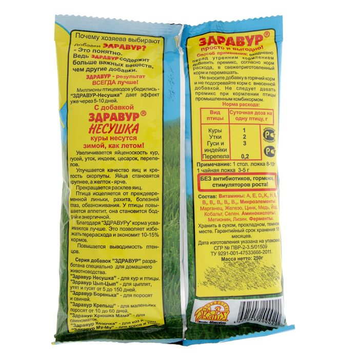 Кроме того, «Здравур Несушка» помогает сэкономить корма! Специальные кормовые ферменты, содержащиеся в ней, повышают усвоение организмом питательных веществ из корма. Благодаря этому ни один грамм кормов не тратится зря! «Здравур Несушка» очень выгодна в применении: курице в день требуется всего 1 г добавки, а прибавка яиц составит до 5–6 штук в неделю.